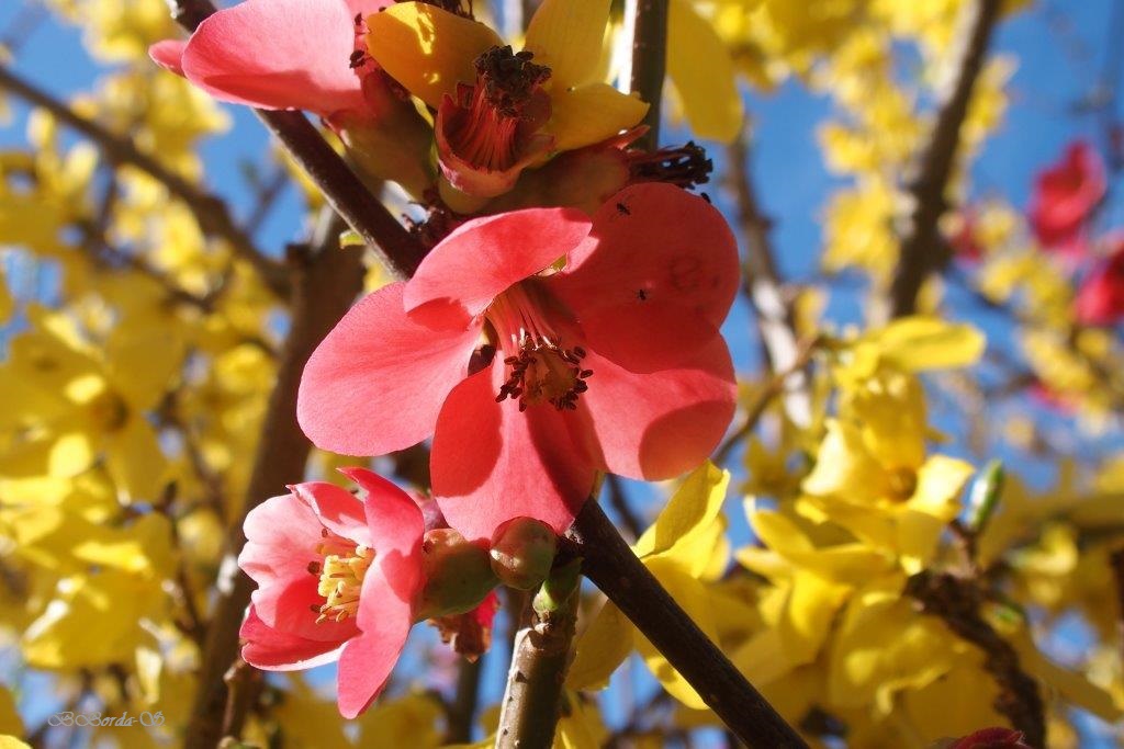 Justement, résultats des tempêtes Nils et Pedro, certains arbustes mitoyens ont été bien malmenés, et notre voisin a décidé de nettoyer la haie de son côté. Je sais bien que ces arbustes sauvages repousseront rapidement, mais je ne sais pas si vraiment c’était le moment, pour les oiseaux… il leur en reste, les terrains juste autour de nous n’étant pas cultivés les haies sont encore là, mais je n’étais pas très fière. Bref, ce que nous appelons « le chemin », qui borde notre terrain, est un peu plus dégagé maintenant. Et on voit mieux le pêcher « de Germaine », tout fleuri !