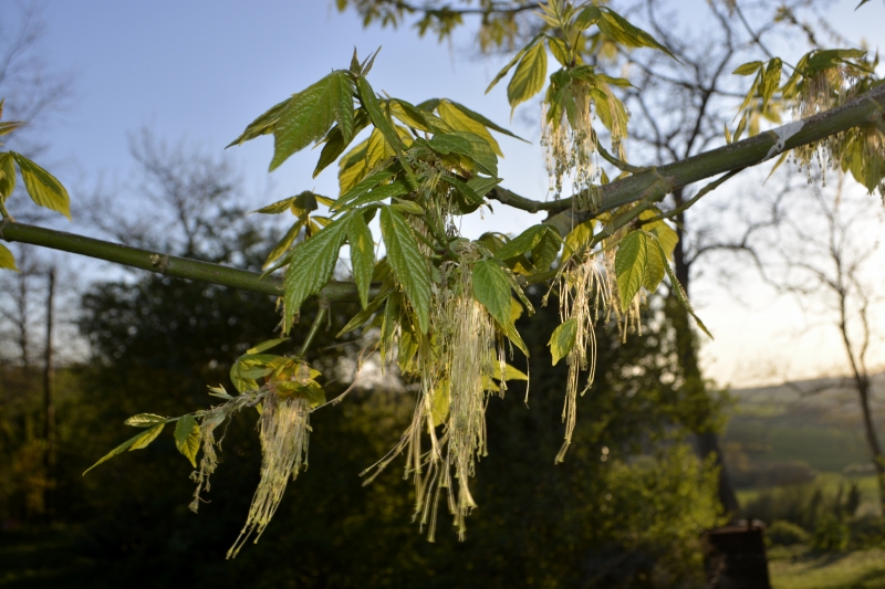 Les chênes plus que centenaires (nous en avons au moins trois dans le hameau) sont encore nus, tandis que sur certains arbres de jeunes feuilles ou des fleurs pointent leur nez, et les lilas commencent à fleurir le long du chemin du Moulin…