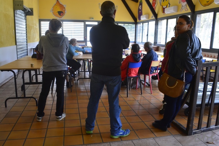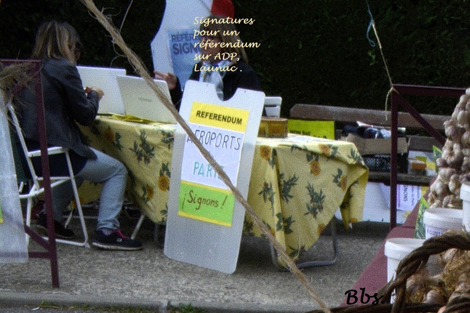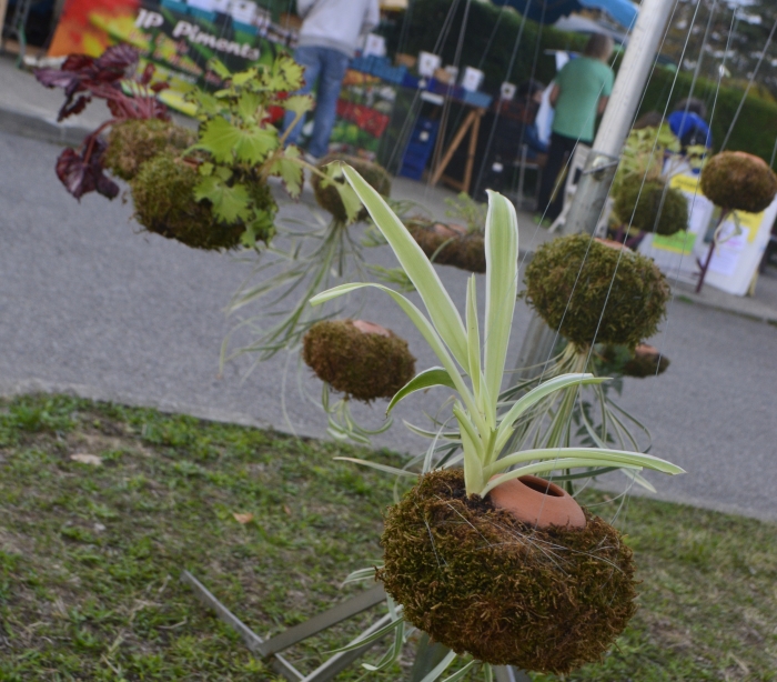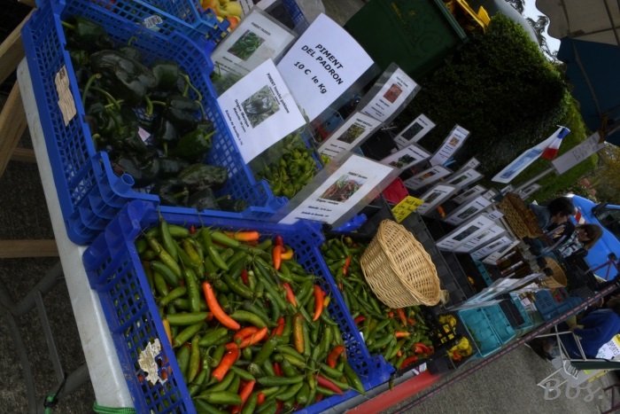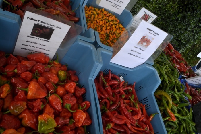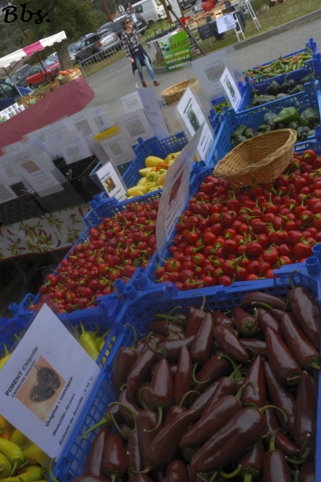 Bon, mais avant d’en arriver là, il y avait plein de découvertes à faire, dès l’entrée de la salle des fêtes. Producteurs bios de piments (je n’ai pas compté les variétés, mais Espelette peut aller se rhabiller…), d’ail dans tous ses états, d’huile, de potirons et potimarrons, de plantes aromatiques, de patates douces de toutes les couleurs (enfin, presque), de fleurs de saison, et même, dans un coin, quelques irréductibles citoyennes ont profité de l’occasion pour faire signer la demande de référendum à propos des aéroports de Paris.