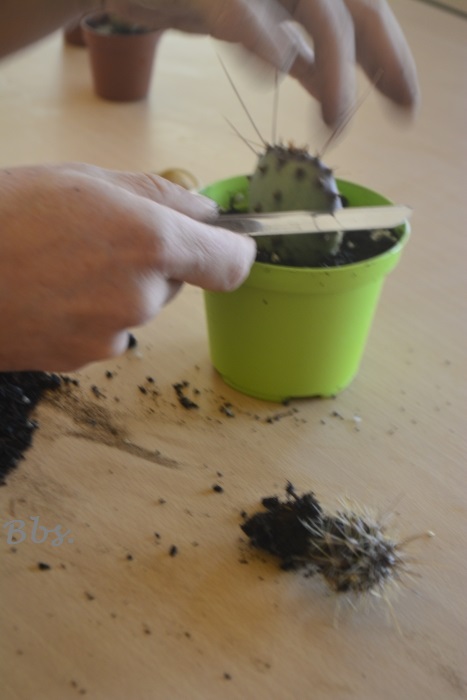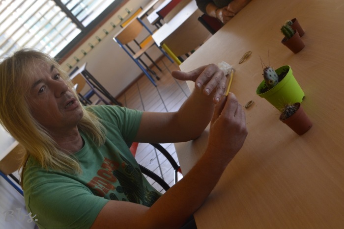 Ce n’est pas très évident, ce fruit, quand il est ouvert… rouge, brillant, plein de graines, les morceaux vous glissent entre les doigts… mais c’est bon ! Parmi les animations proposées, nous avons appris (bien que ce ne soit pas le moment) à faire des semis de nopal : vous ouvrez le fruit, vous le mangez, en prenant soin de ne pas avaler les graines (il l’a dit trop tard, pour ma part, j’avais déjà tout mangé 😉 ), puis vous nettoyez ces graines, vous les séchez bien, vous préparez un petit pot avec un mélange de terreau et sable, vous ajoutez de l’eau, vous patouillez bien tout ça, vous remplissez votre pot de ce substrat, presque jusqu’en haut, vous posez vos graines, vous ne les enfoncez pas, juste un peu tassées, vous couvrez d’une couche de sable, et vous n’oubliez pas d’arroser tant que la plante n’a pas pointé le bout de sa feuille !