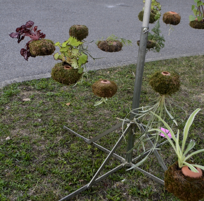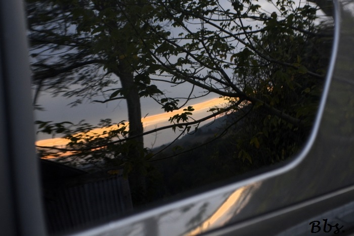 Avec tout ça, l’après-midi, même avec une heure en plus, est vite passée ! J’ai laissé les kokedamas se balancer devant la salle, certaines plantes tête en l’air, d’autres tête en bas 😉 , et arrivée à la maison, le soleil commençait à décliner… reflet sur les vitres de la voiture !