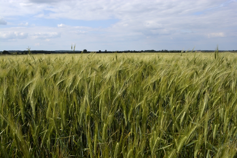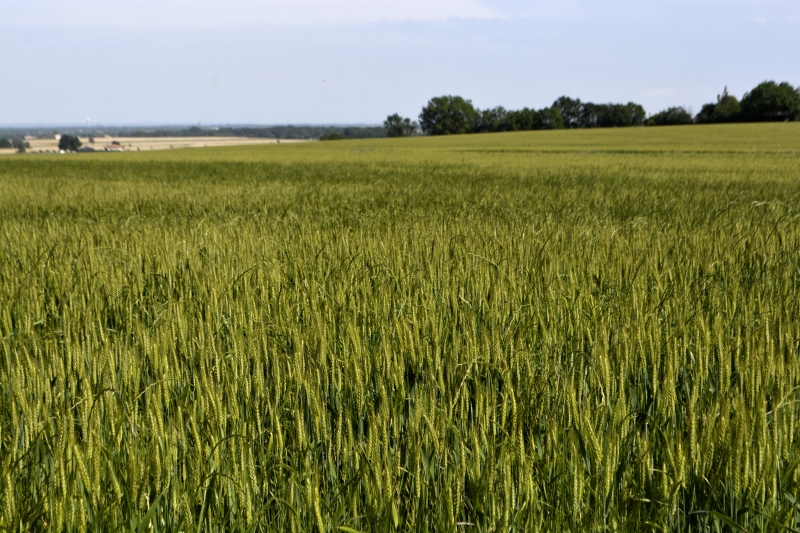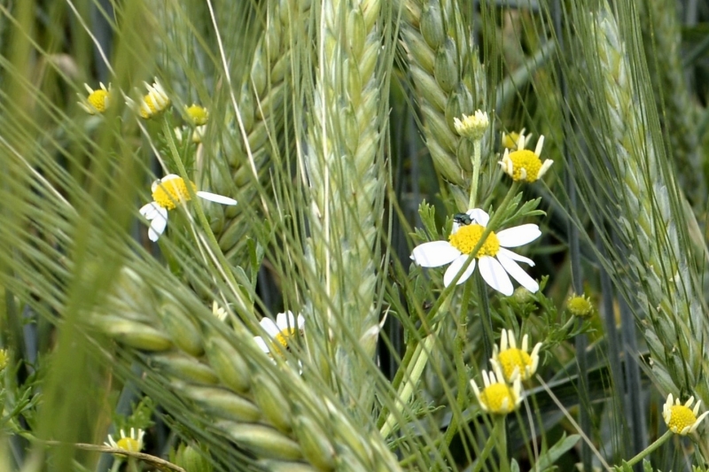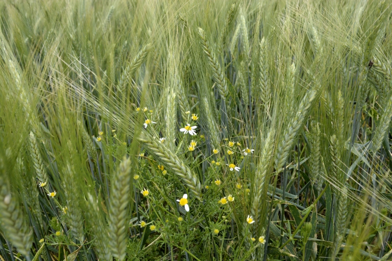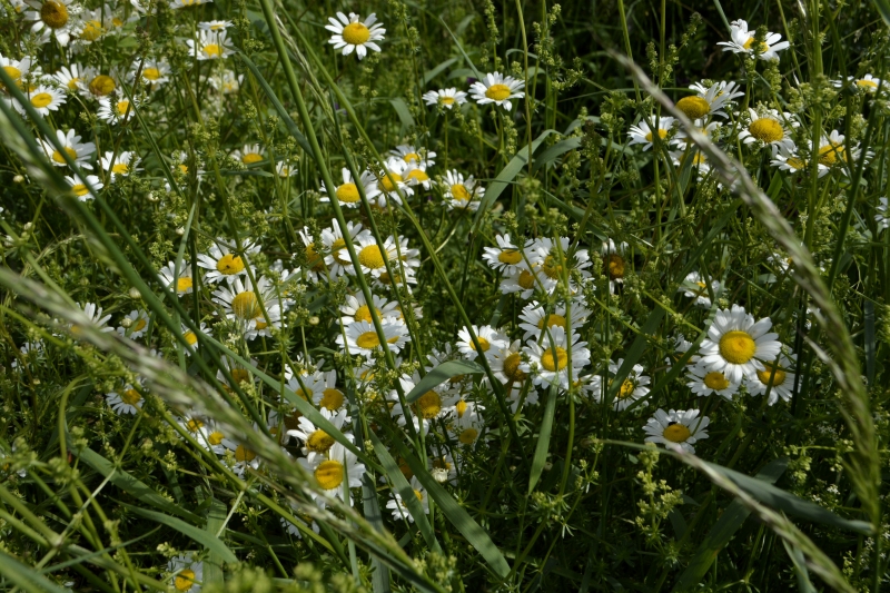 Nous retrouvons le grand chemin, parsemé de milliers de pâquerettes, un côté avec un fossé bordé d’herbes, de marguerites, de pissenlits, et l’autre côté bordé de champs cultivés. Cultures à venir, ou blé encore vert. Des marguerites se mêlent aux épis. En bout de champ, quelques coquelicots.