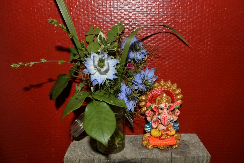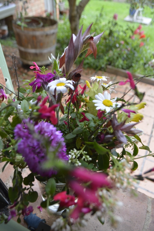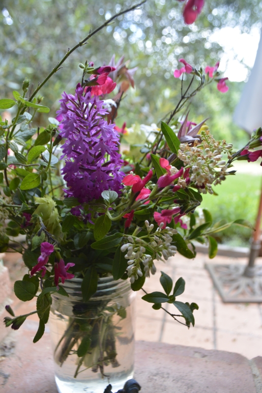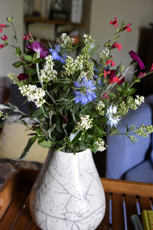 J’ai un peu craqué, et contrevenu à mes principes de ne pas couper les fleurs sur pied… elles se fanent tellement vite dans un vase ! Mais c’est vrai qu’avec la pluie et le vent de ces derniers jours, j’ai pensé qu’au fond elles seraient aussi bien à l’intérieur… et, pourquoi ne pas éclairer la maison avec ces couleurs ? Fleurs des haies, des champs, ou semi-sauvages… du violine au rose en passant par le bleu, le rouge, le blanc, une vraie symphonie !