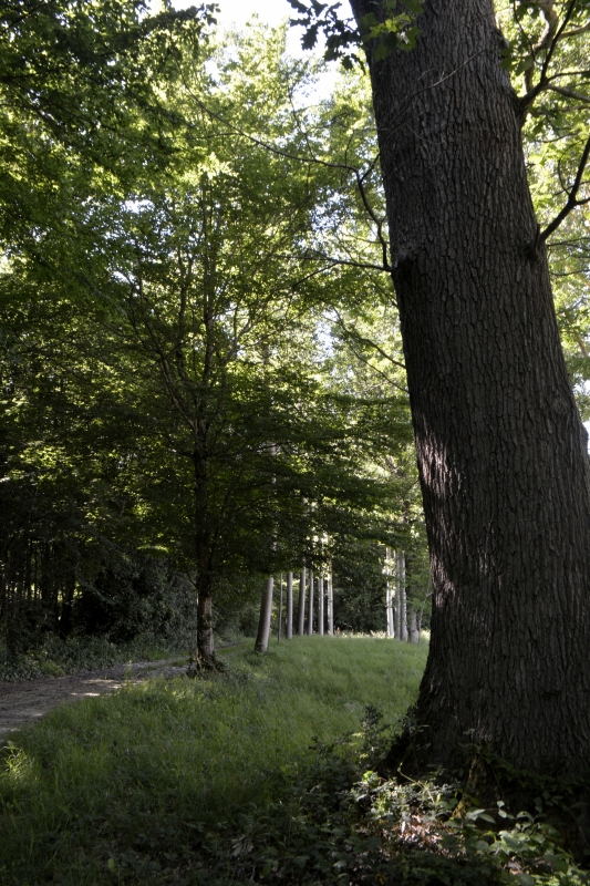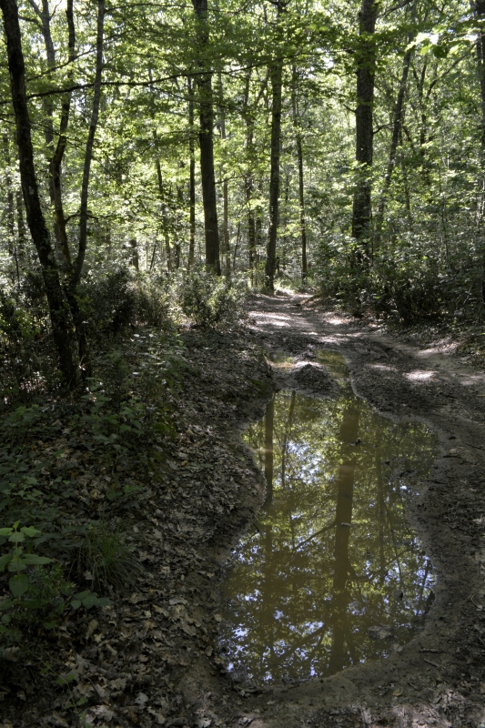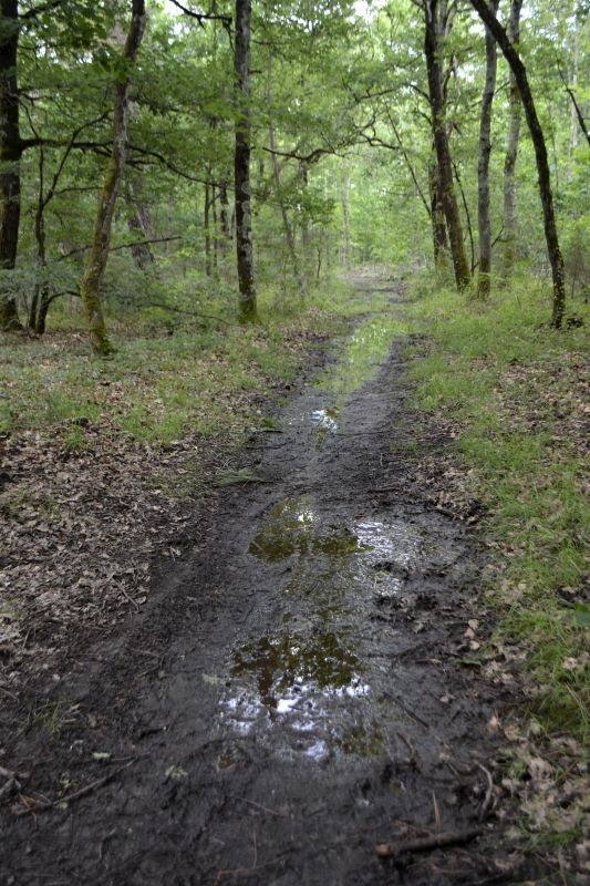 Mais une fois arrivé au bout de ce chemin, changement complet d’atmosphère. Du vert, des verts même, des plus lumineux au presque noirs, mais aussi des chants d’oiseaux (et venant d’un trou dans le tronc d’un arbre toute une série de gazouillis !), ombres et lumières, géométrie des troncs, une cabane, la grande allée et le chemin serpentant dans le bois… par endroits encore empli de flaques d’eau !