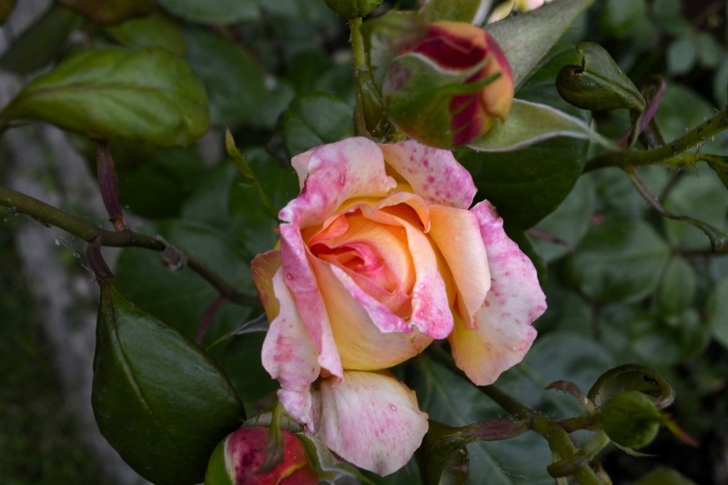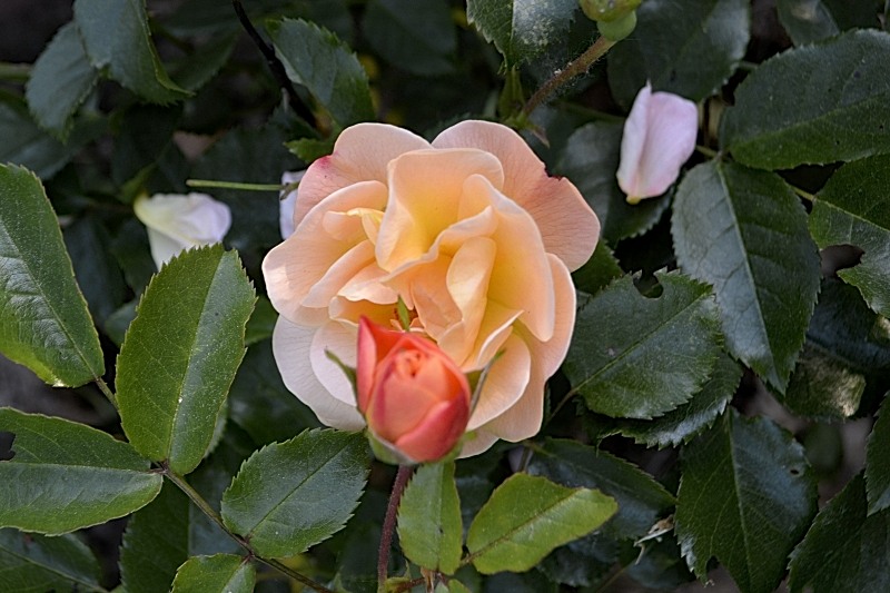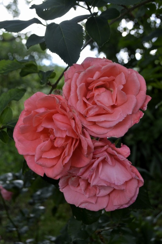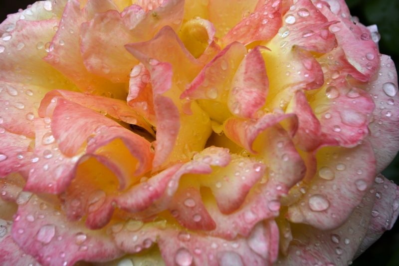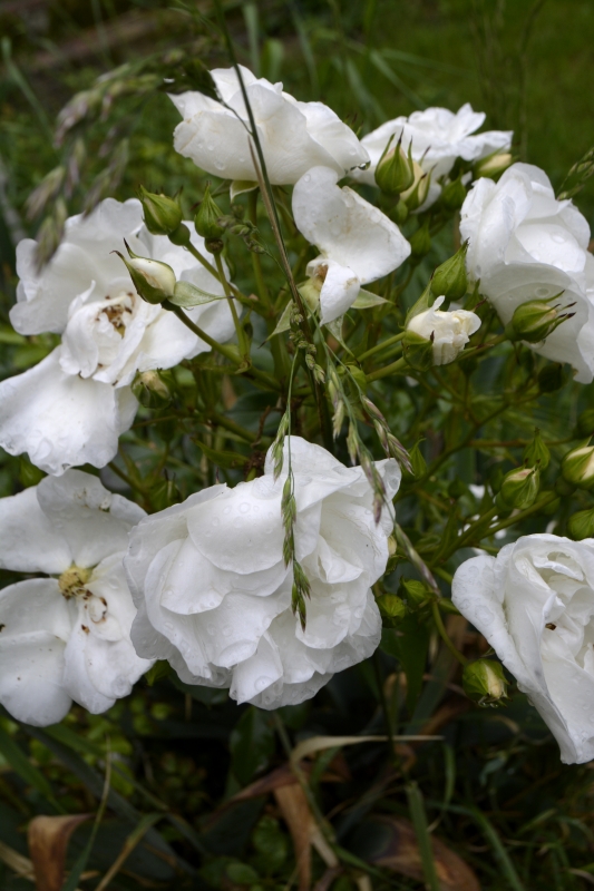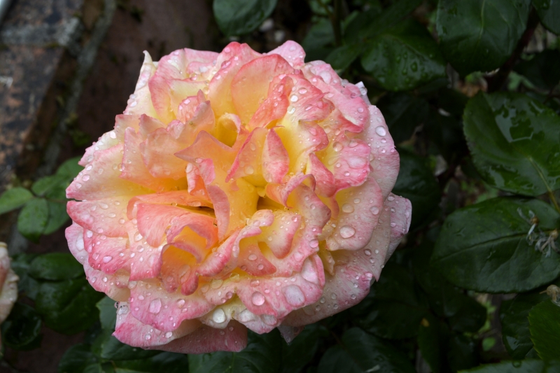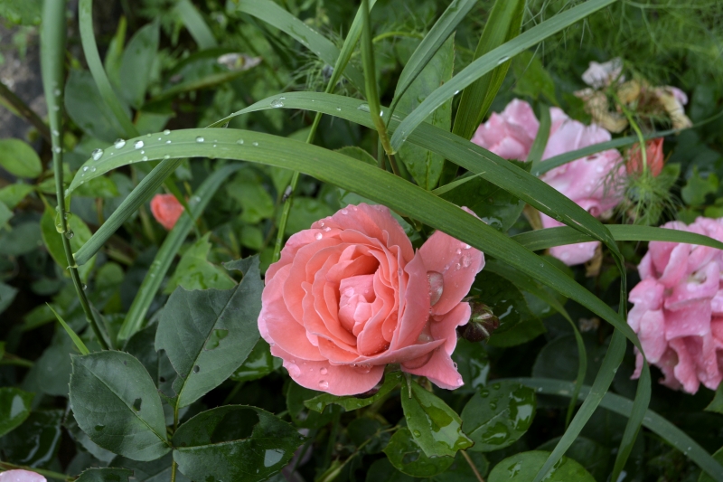 Les rosiers font ce qu’ils peuvent sous ce déluge… Hélas, si les fleurs sont magnifiées par les gouttes d’eau, elles devront encore subir pluie et vent pendant une semaine.