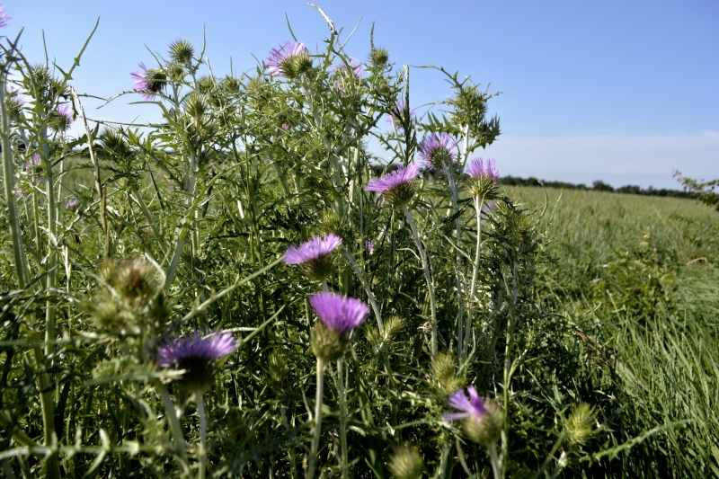 (oui, je sais, c’est plein de correcteur… ). Je n’ai pas fait un bien grand tour, mais une heure tout de même. Porté du pain à l’âne gris, qui cette fois avait de la compagnie dans son pré, une jument magnifique et son poulain. Pas de photo, désolée, elle semblait un peu inquiète, je ne me suis pas attardée. Les champs à perte de vue sur « la plaine », et du vent sur les chardons.