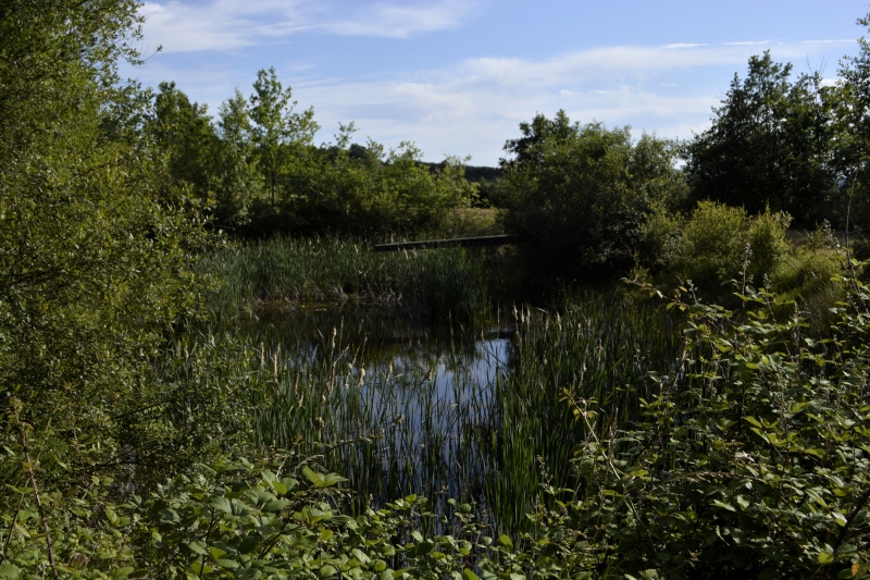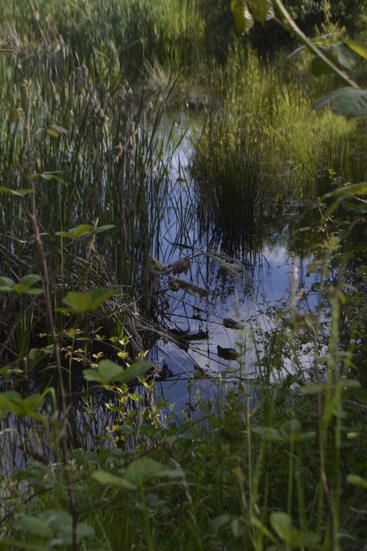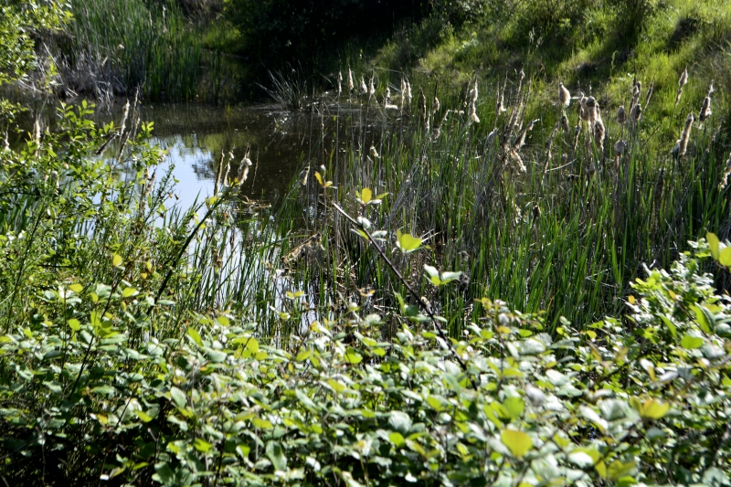 Arrêt coup d’œil sur le petit réservoir, pas très rempli, les « quenouilles » des joncs se reflétaient dans l’eau, mais je n’ai pas vu de libellules. Pourtant, d’habitude elles sont là.