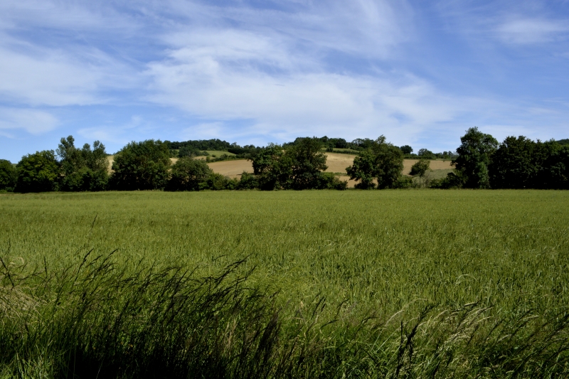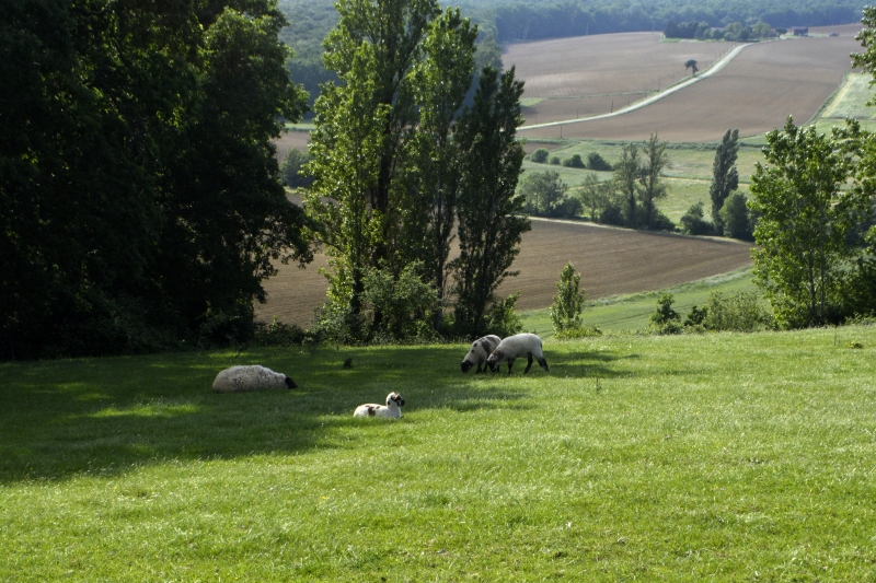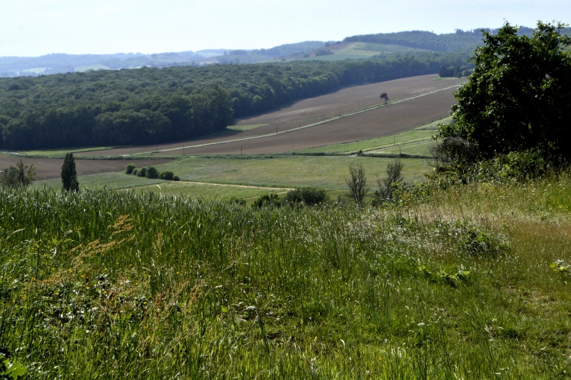 Nouvel arrêt (vous comprenez pourquoi, même sur une petite distance, je mets autant de temps… ce circuit doit faire au maximum 1,5 km !, mais je remplis l’heure autorisée), pour admirer les coteaux, les champs ocres, les champs verts, le bois vert sombre.