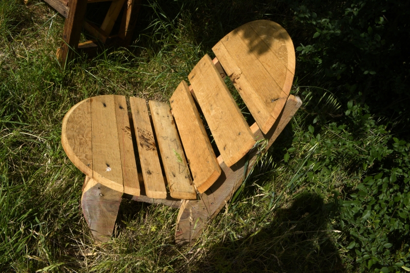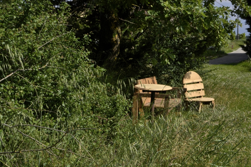 Et c’est l’arrivée aux premières maisons. Et là, face aux collines, aux champs, au soleil du soir, les occupants des lieux ont installé des sièges pour profiter de la vue magnifique, bien mieux que devant un poste télé 😉 ! J’ai beaucoup aimé la fabrication « maison ».