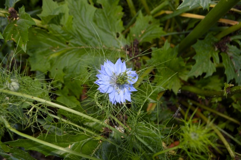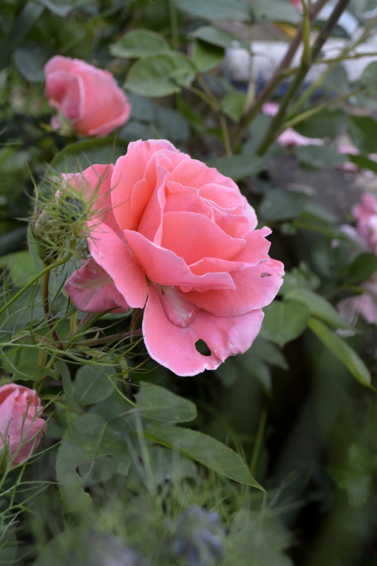 Au jardin, les roses se multiplient… seules les petites roses rouges se font désirer ! L’acanthe et les nigelles commencent à fleurir. J’ai même trouvé un kalanchoé (je crois), caché sous les feuilles d’acanthe…