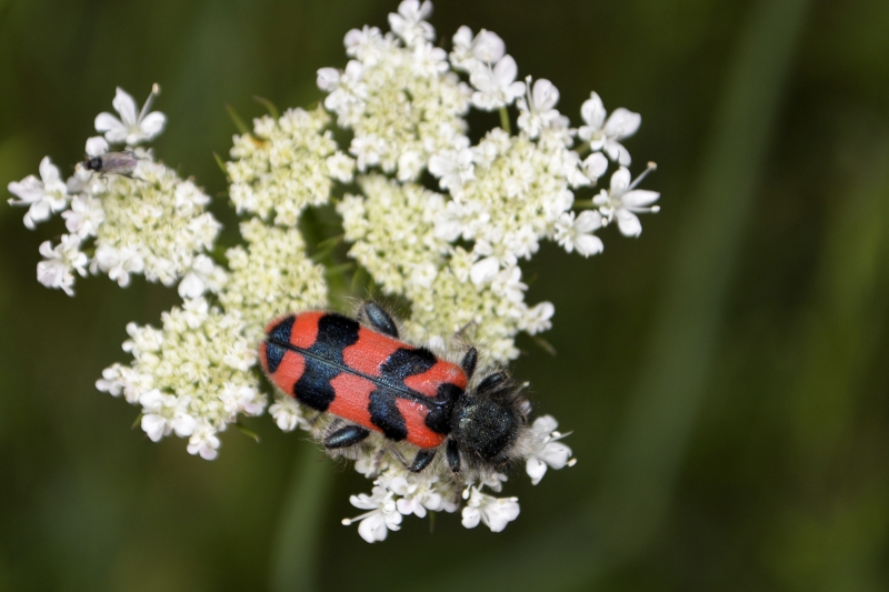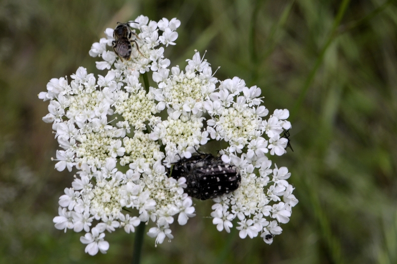 Peu de fleurs, hormis des églantines, et ces ombellifères dont j’ai du mal à trouver le nom, berce ?, qui accueillent les insectes quelles que soient leur couleur (et leurs activités…)