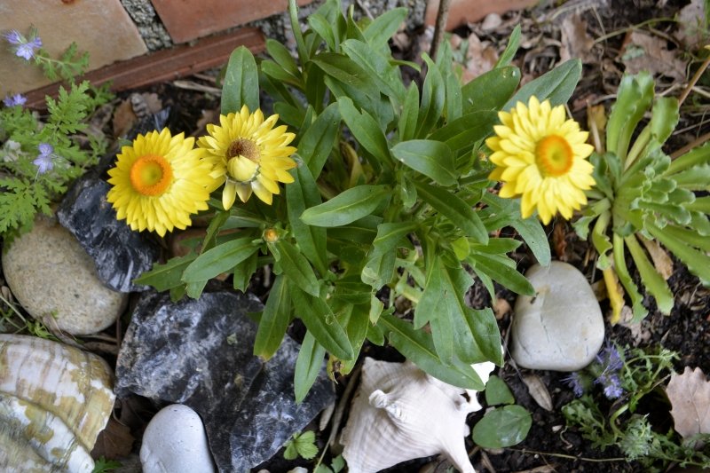 Dernière arrivée au jardin, une immortelle. Elle semble se plaire contre le mur, en compagnie des galets, cailloux, coquillages…