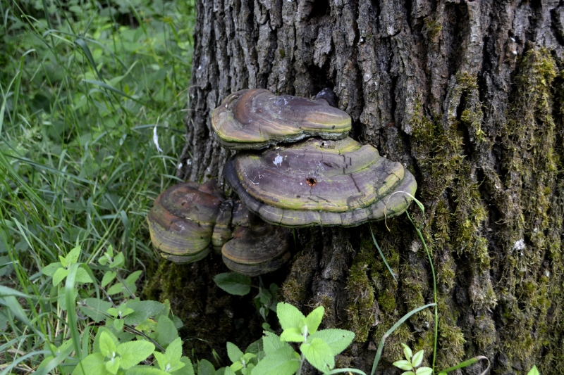 Au pied d’un tronc, d’énormes champignons, « langues de bœuf ».