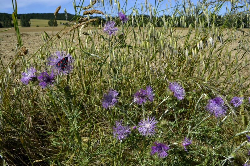 Nous sommes reparties vers la route du Burgaud, en passant près d’une ferme. Un long chemin sous le soleil, entre les champs, avant d’arriver à la route. En face de nous, c’est toujours Galembrun. Sur les bords du chemin, chardons en fleurs et autres champêtres.