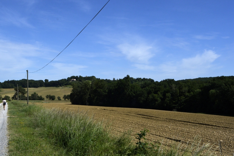 On reprend la grimpette pour retrouver la route de Pelleport… et toujours les collines, les champs, verts clairs, sombres, acidulés mélangés, avec le rouge des coquelicots, ou ce rose vif sur un talus inondé de rosiers (devenus) sauvages.