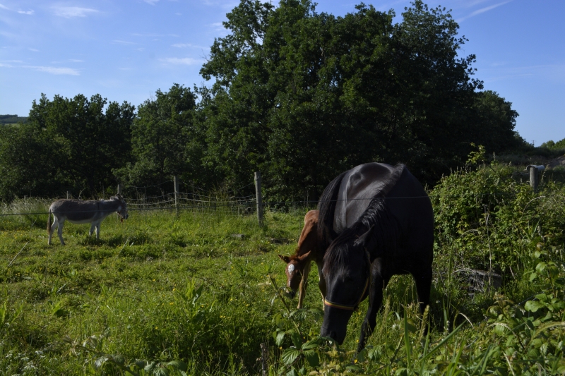 A l’entrée de Galembrun, la jument et son poulain tiennent toujours compagnie au vieil âne gris, à la croix de Saint André sur le dos.