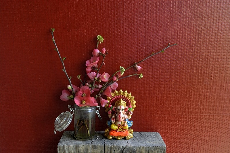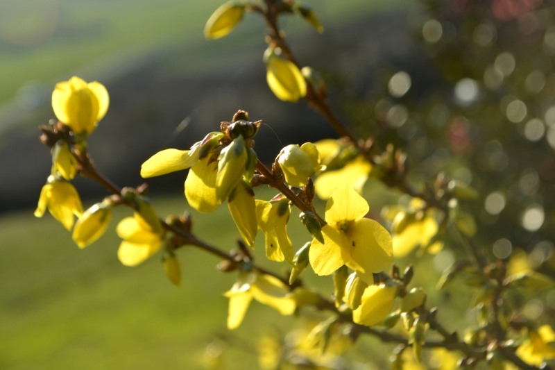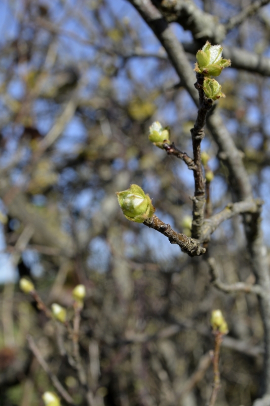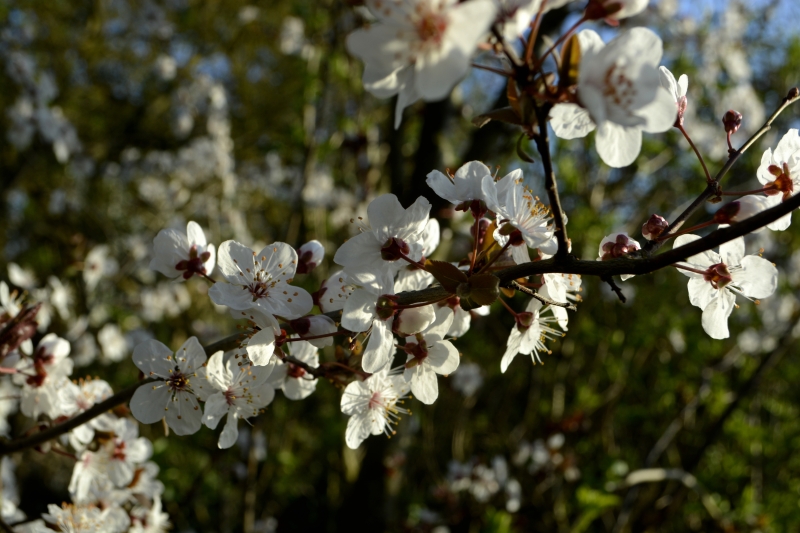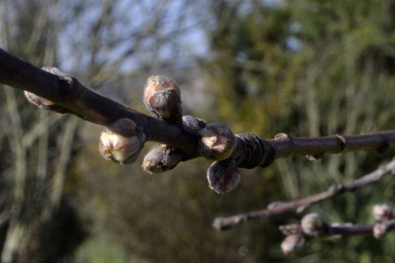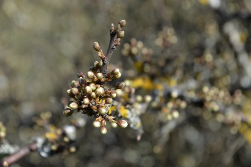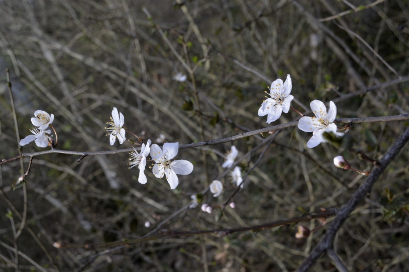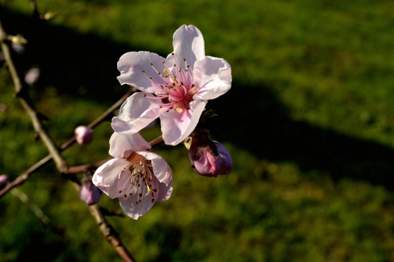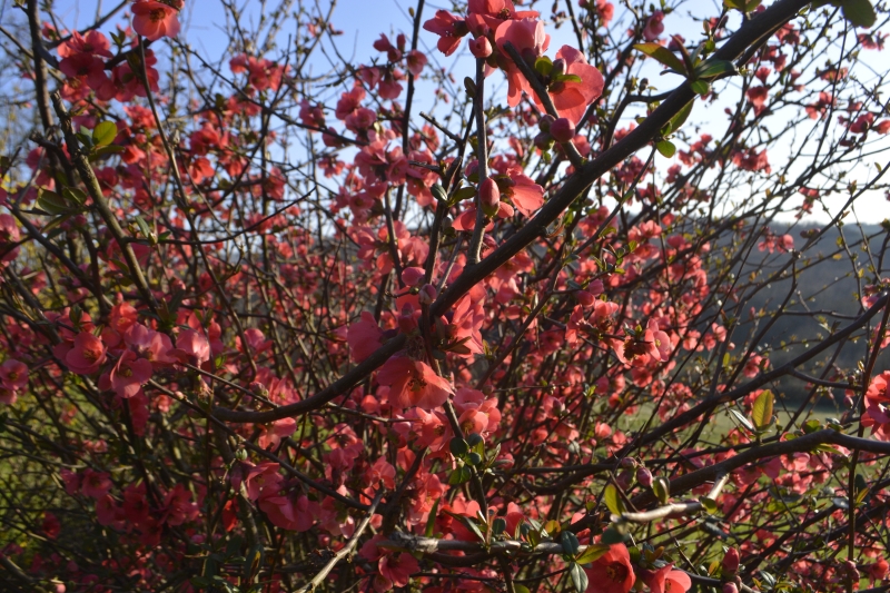 Avant d’arriver dans le champ en jachère où en mai/juin je retrouve les orchis et orchidées sauvages, il faut traverser celui de Germaine, dont la partie proche de la maison est toujours entretenue par son fils : jardin à la terre fraîchement retournée, mais surtout beaucoup d’arbustes, des fleurs, et quelques fruitiers. Le rose délicat des fleurs de pêcher… quelle douceur !