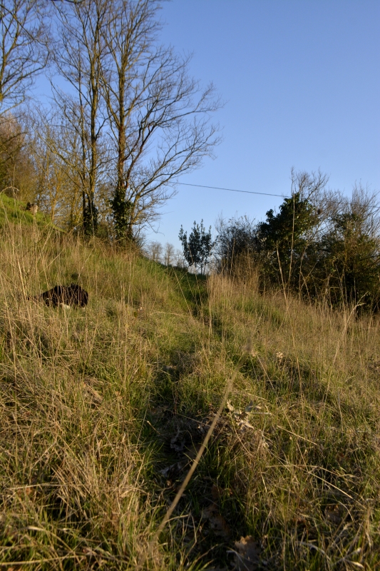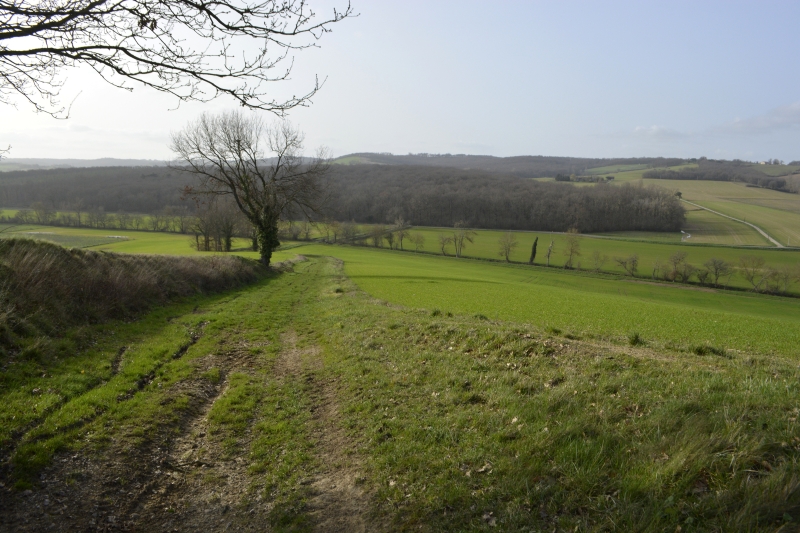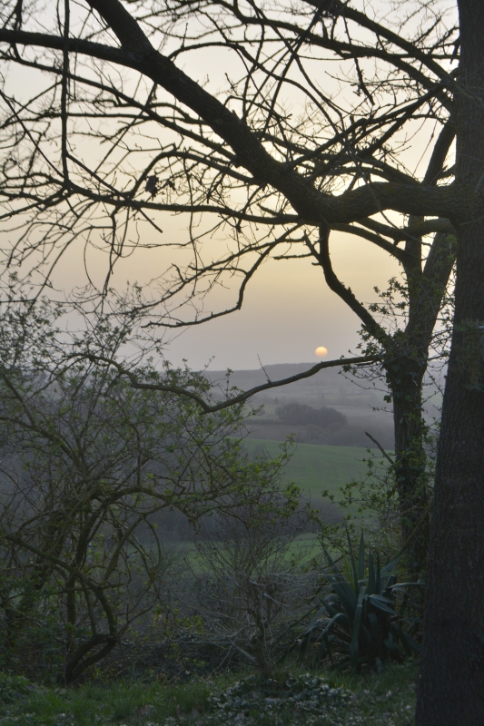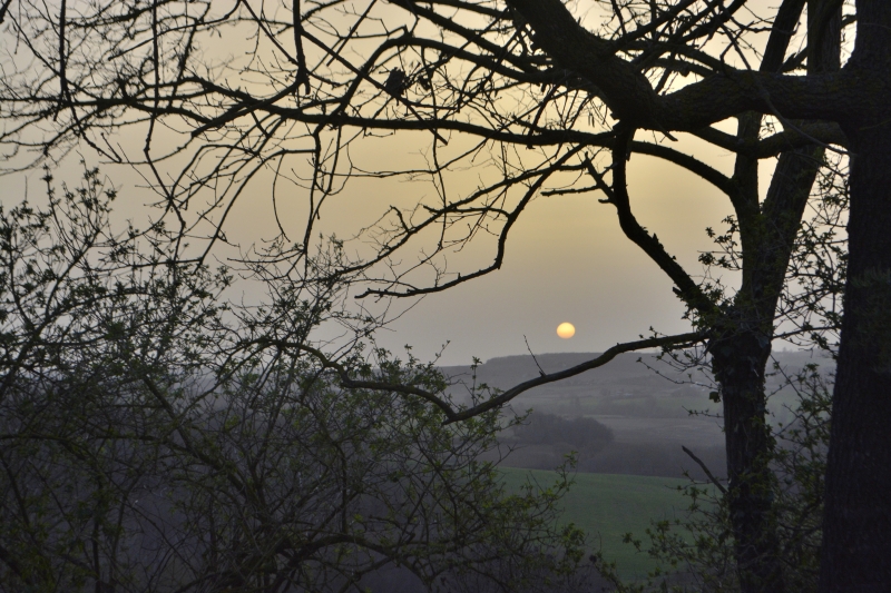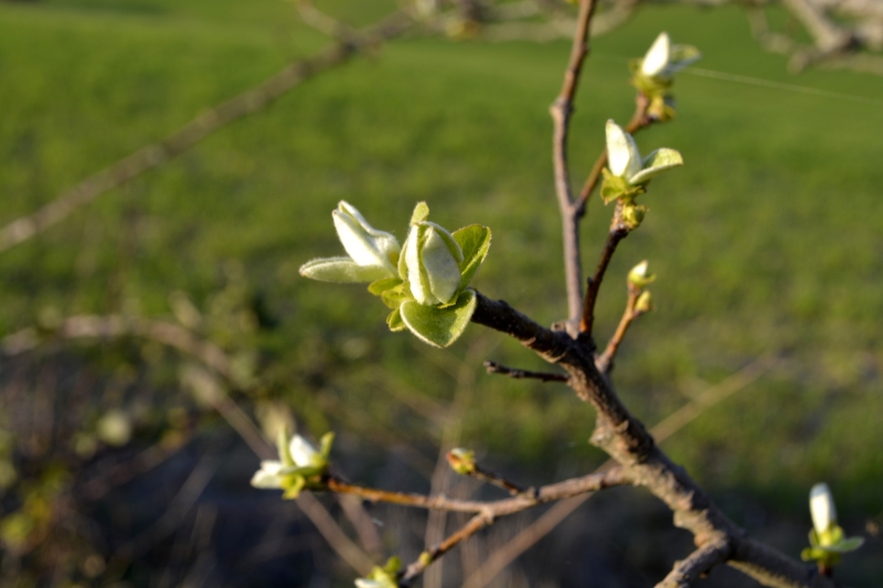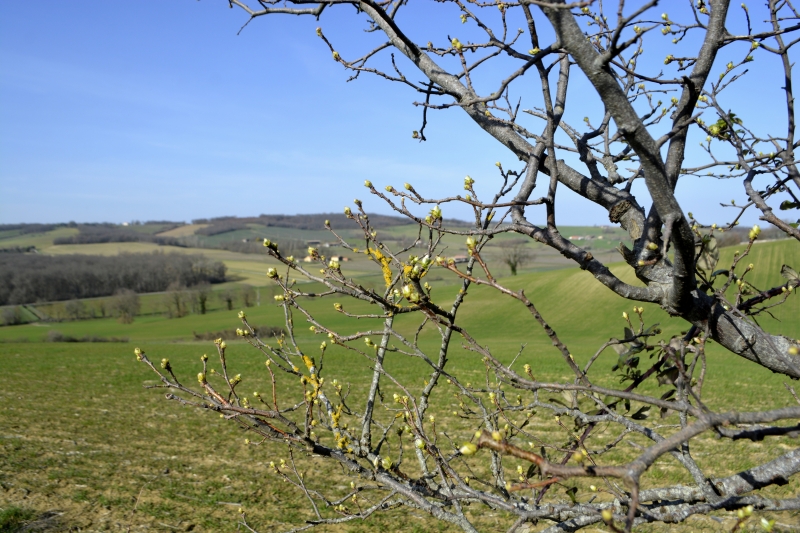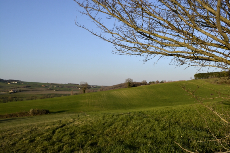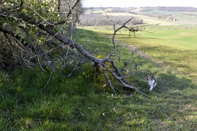 Au bout du champ, cette vue sur le vallonnement des champs travaillés, devenus verts, dont je ne me lasse pas… avec le coing qui autrefois marquait les limites des champs. Il y a une semaine, il était à peine en bourgeons, maintenant il se couvre de feuilles vert tendre. Pas assez de temps cette fois, mais il va falloir que j’aille vérifier si l’ancien chemin qui autrefois descendait jusqu’au ruisseau est toujours accessible, mais avec le remembrement et les rachats de terres, j’ai peur que ce ne soit plus possible…