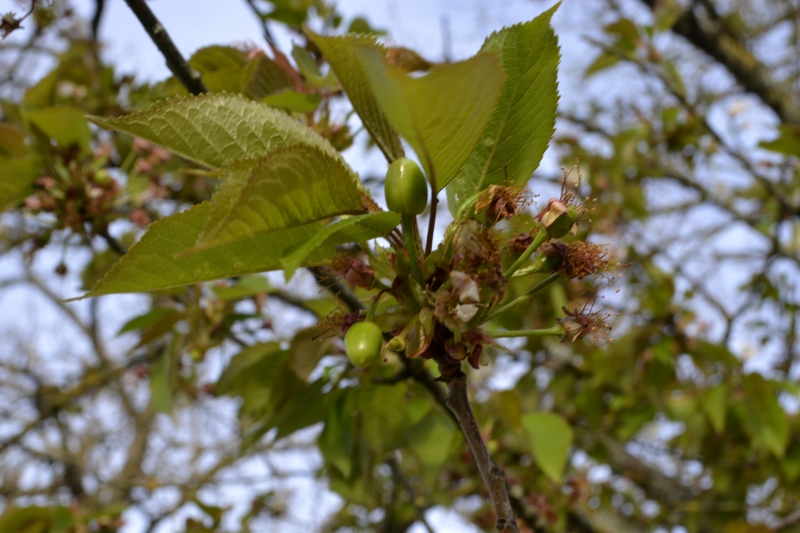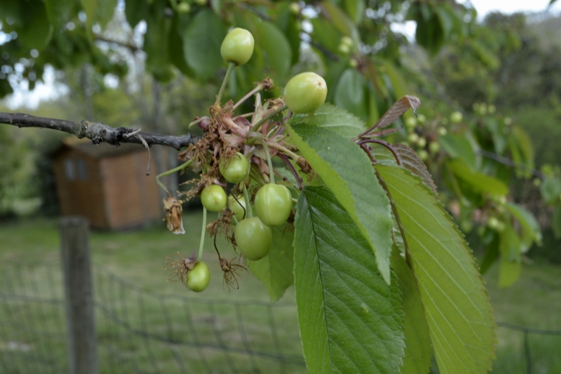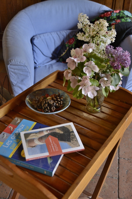 Dans les haies, le lilas est en fleurs. Je m’offre un petit bouquet de lilas et fleurs de coing… Et dans le jardin les cerises apparaissent. Peut-être que les oiseaux nous en laisseront quelques unes !