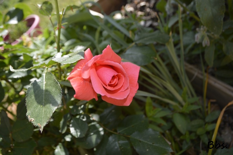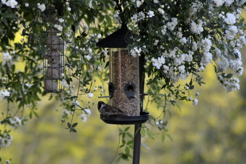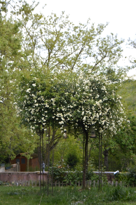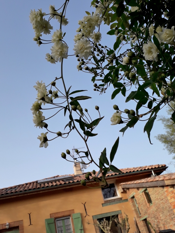 Et le vieux rosier, arrivé ici il y a plus de 40 ans, continue de nous offrir ses roses. Quant au rosier liane et ses petites roses crème en pompon, c’est le refuge des oiseaux qui vont et viennent des mangeoires aux haies proches (un vrai tourbillon que nous regardons fascinés lors des repas sur la terrasse), et nous régalent de leurs chants. J’ai vu un nid bien à l’abri des branches, mais vu les piaillements, je pense qu’il doit bien y en avoir d’autres…