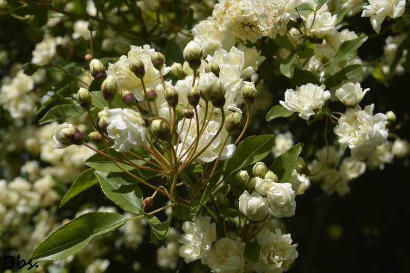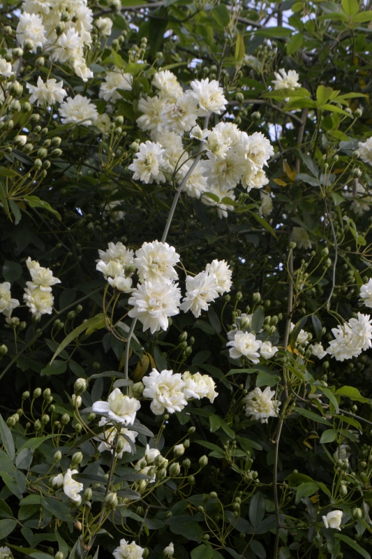 Le rosier-liane cascade et ruisselle de toutes ses petites roses pompons…