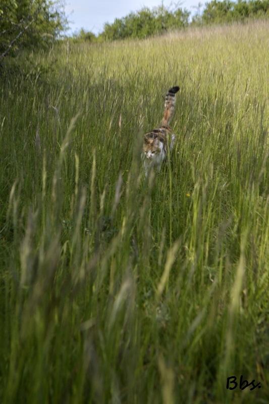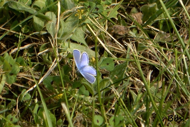 Flipelette prend son temps au milieu des herbes, j’en profite pour pister un couple de papillons bleus… de loin !
