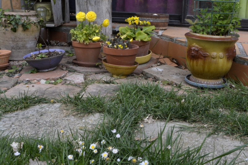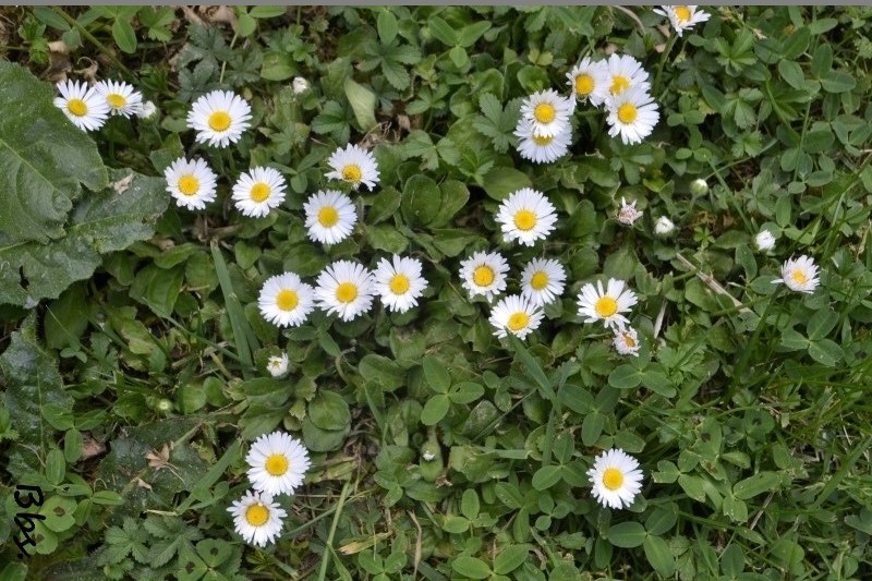 Sur le chemin près de la maison, toujours bien entretenu, les princesses du printemps, des tapis de pâquerettes qui relèvent vaillamment leurs têtes après chaque passage de tondeuse.