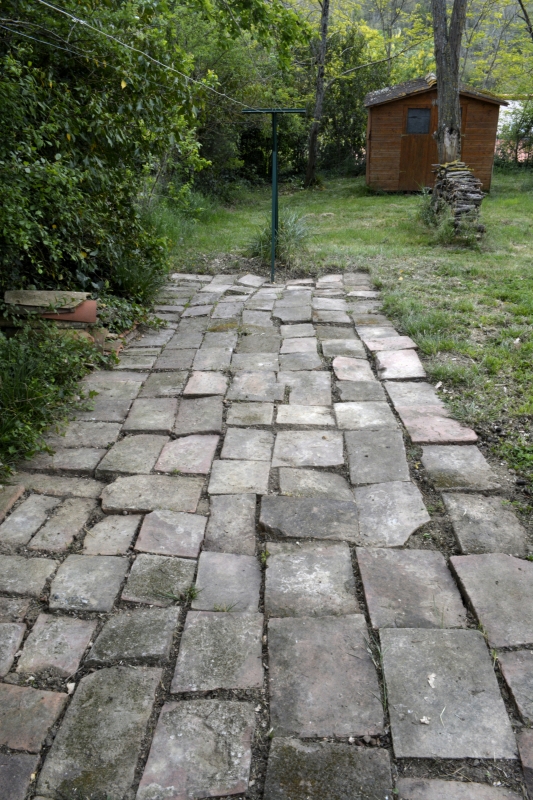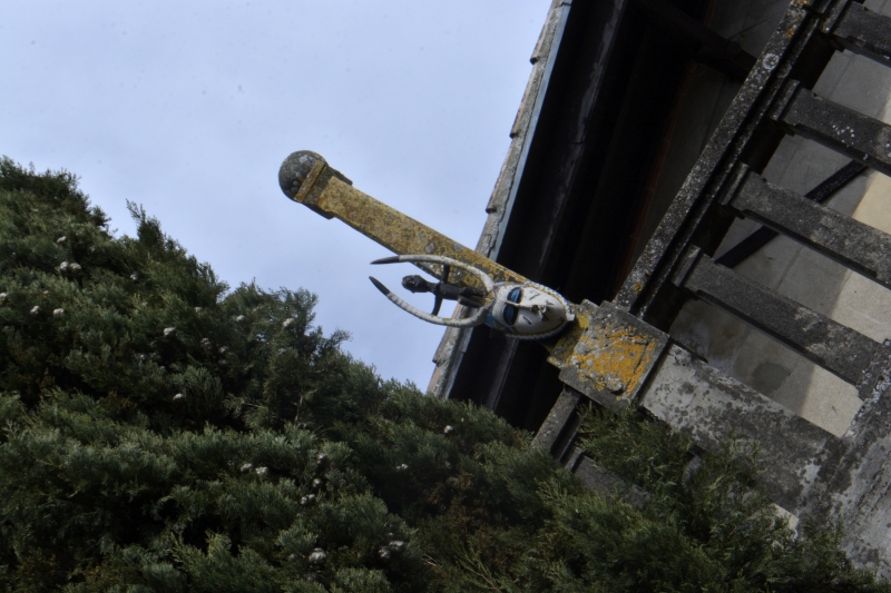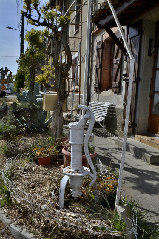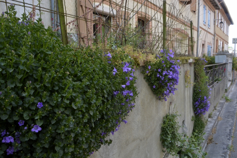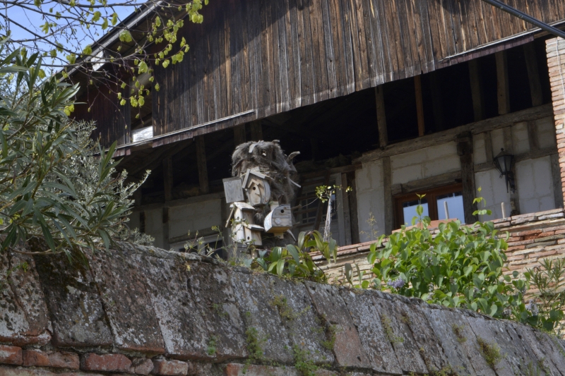 Vieux murs en travaux, petites curiosités, ici un mât de nichoirs à oiseaux, là un mur inondé de lobélias cascadant, une ancienne entrée, un passage fermé entre deux grandes maisons, le beau carrelage sous un couvert, des masques africains comme des totems en haut d’un balcon, le mélange briques et galets d’un mur, ou bien ce vieux mur en terre crue, les avancées de poutres à la limite de l’étage…