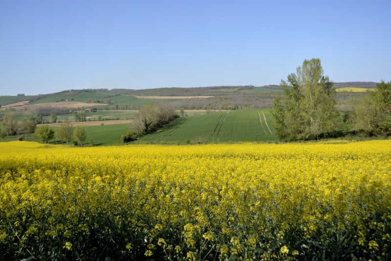 Un dimanche pascal très occupé ! Le marché le matin, puis il a fallu faire la cloche et semer dans le jardin quelques œufs, chocolats et autres gourmandises. Après le repas, balade d’un peu plus de 2 heures dans les environs, montées et descentes au menu… et les couleurs éclatantes du paysage : ciel bleu sans nuage, champs de blé encore vert, de colza lumineux, et de la richesse cadoursienne : l’ail !, entrecoupé de champs juste labourés (pour le tournesol de l’été, probablement).