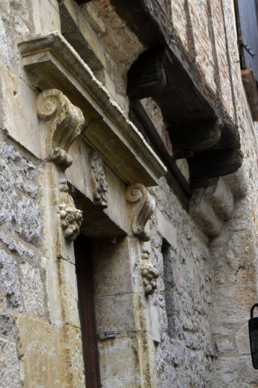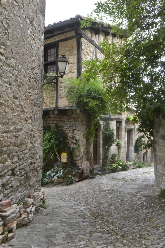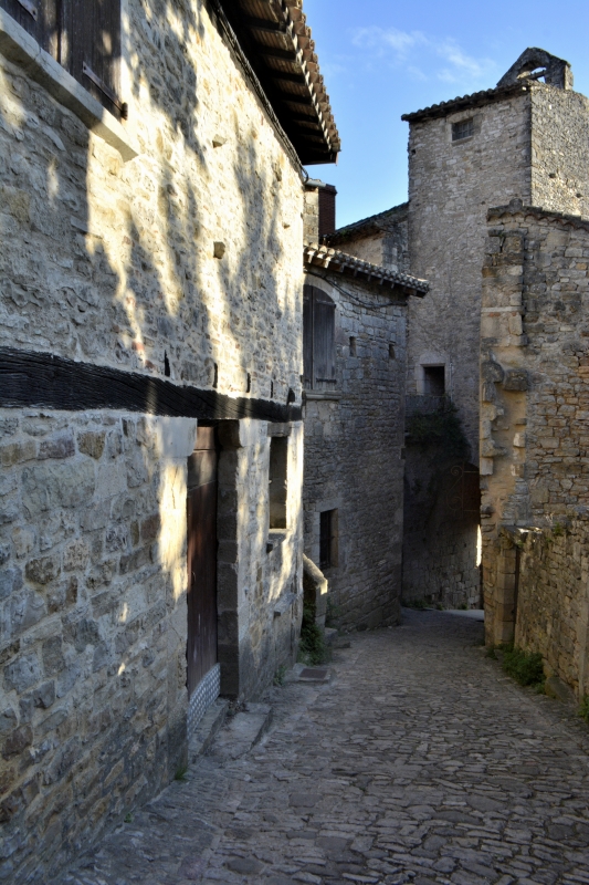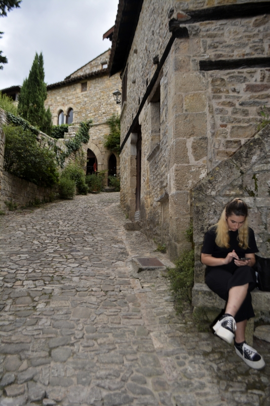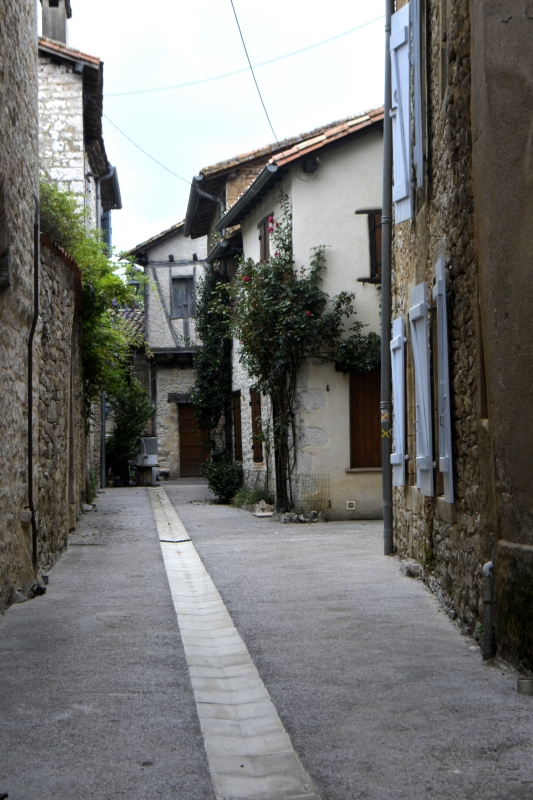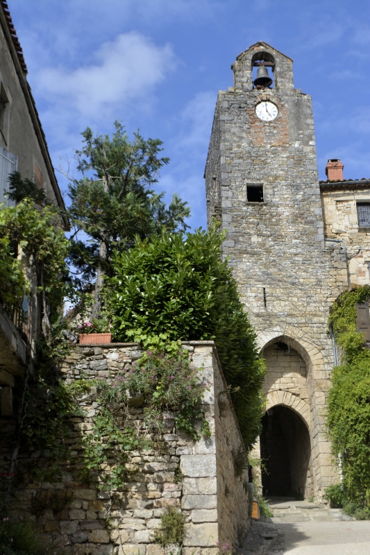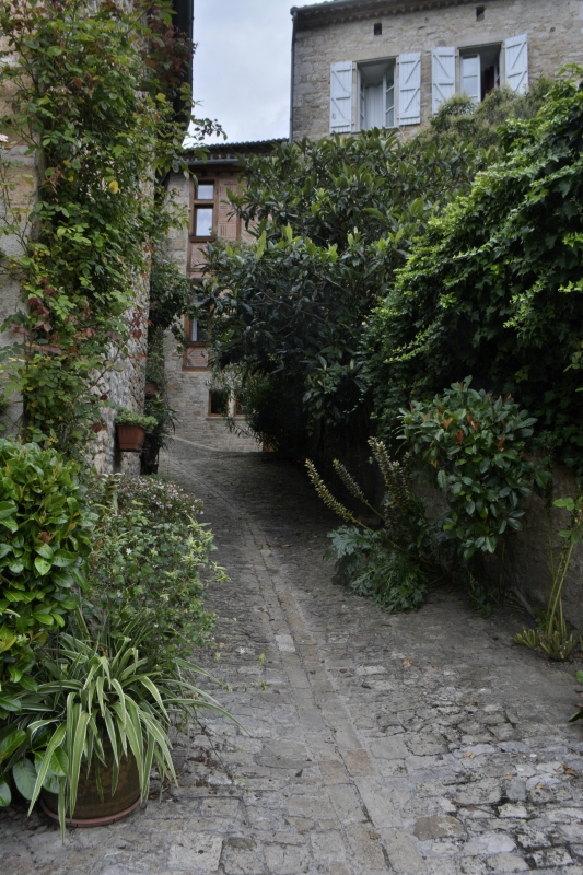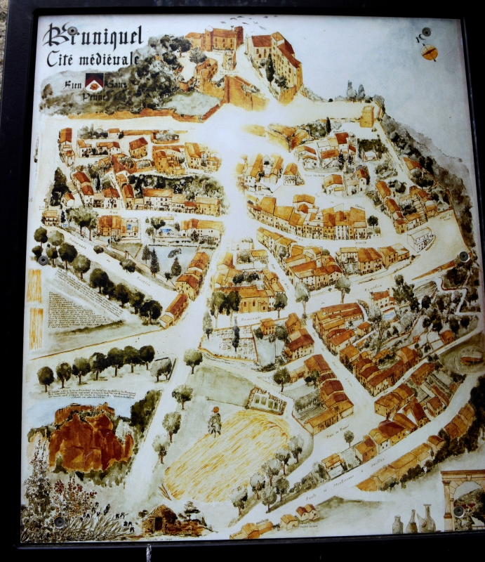 Et après Montricoux, nous voici à Bruniquel. Là aussi, l’Histoire est présente depuis l’ère paléolithique (exposition dans le château), un scribe de Moissac fait mention pour la première fois du village au XI° siècle sous le nom de Brunichildum (une légende attribue la fondation de la cité à la Reine Brunehaut, qui fut effectivement une grande bâtisseuse). Quelques séquelles de la guerre de 100 ans, et si la croisade des Albigeois épargne Bruniquel, les guerres de religion vont accroître l’opposition entre les deux châteaux postés tout en haut du village puisque le château vieux appartient à un vicomte catholique et le château jeune à un réformé, constructions et destructions de châteaux et remparts, querelles familiales, bref, en 1987 la commune rachète les deux châteaux et entreprend petit à petit sa rénovation. Pour arriver aux châteaux, il faut grimper la rue principale… heureusement, on peut aussi grimper en zigzagant d’un côté à l’autre, c’est moins fatigant 😉 !