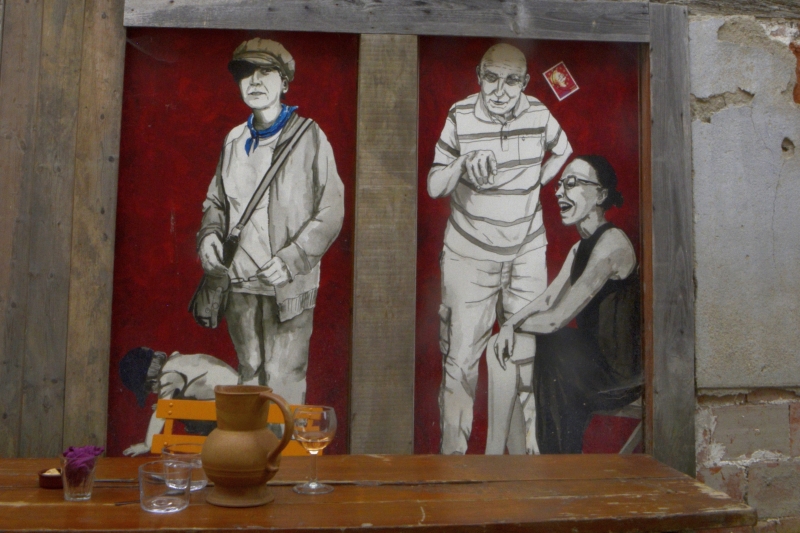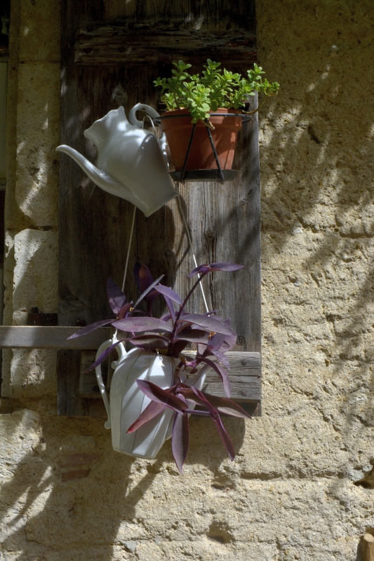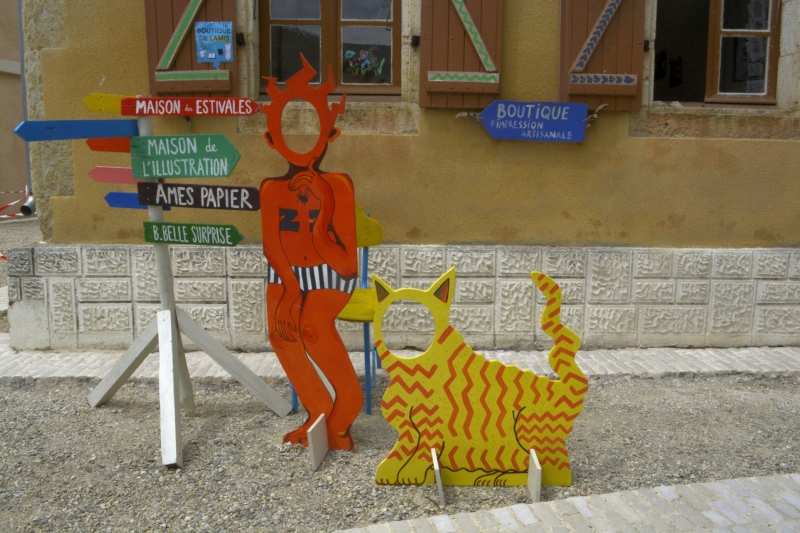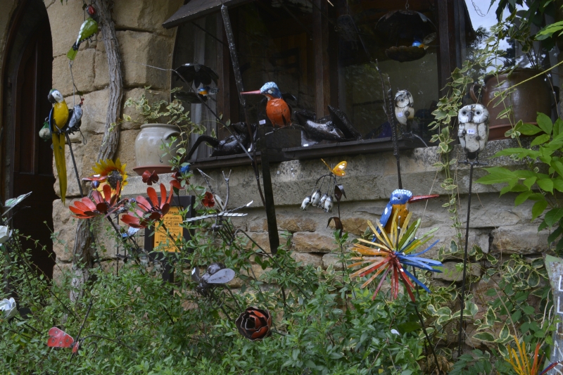 Beaucoup de végétation, vieilles maisons aux jardins clos, de jolies boutiques (mais pas autant qu’à Carcassonne ou au Mont St Michel…) dont une que j’ai particulièrement aimée : des sculptures en recyclage importées du Zimbabwe par une boutique-association. Fleurs, oiseaux bariolés, nous accueillaient au milieu des plantes…