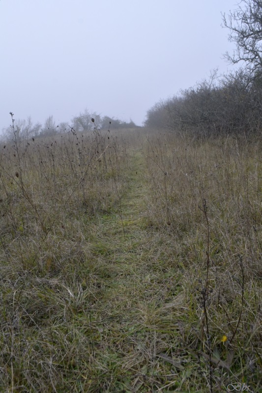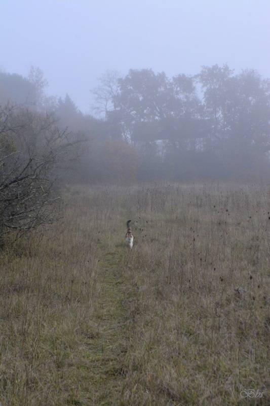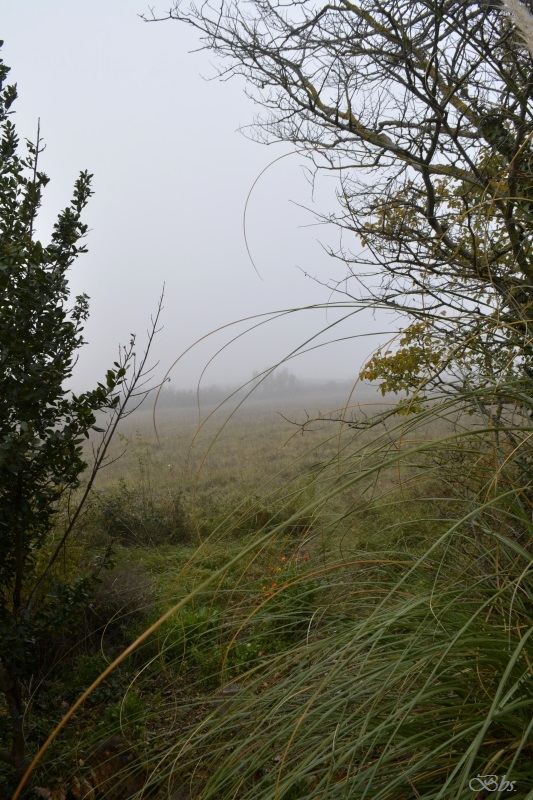 Vers 15 heures, petit tour de champ habituel… baskets trempés au bout de 2 mètres ! Flipelette, qui dormait sur mon bureau, s’est dépêchée de me rejoindre 😉 . Heureusement que les sentes sont bien tracées par les passages des animaux, et aussi que je connais bien ces endroits ! Depuis mon « observatoire à coucher de soleil », la campagne était noyée dans le brouillard, bien différent des écharpes de brumes de certains jours d’automne..