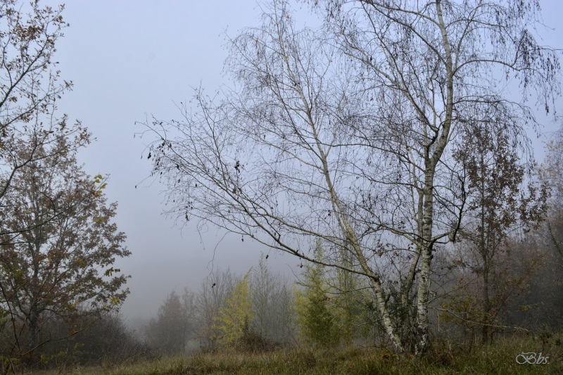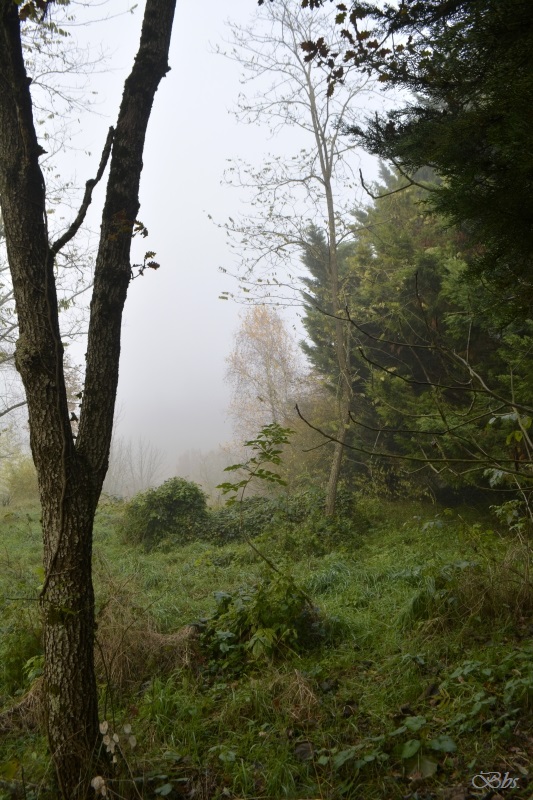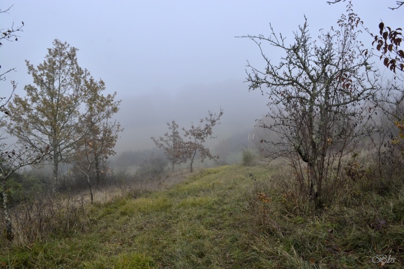 … avant décembre. Ce dernier jour de novembre est… blanc ! Ce matin, blanc du sol au ciel, herbes givrées, poudrées « à frimas » et tout autour le brouillard dense. Disparue la forêt sur la colline en face, disparue la petite vallée… à peine voyait-on les arbres au fond du jardin !
