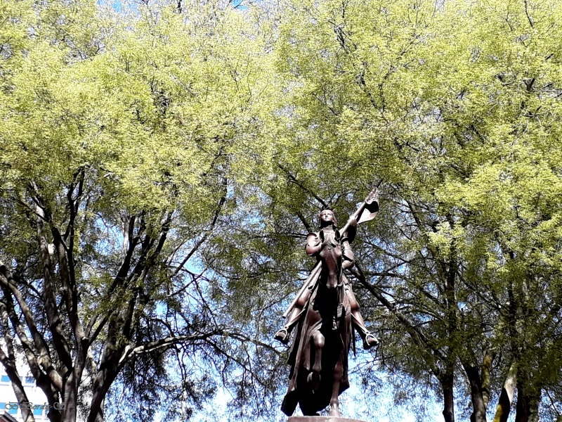 Côté statuaire, quelques personnages célèbres… Plus haut, c’était Carlos Gardel. Il y a bien sûr Pierre-Paul Riquet. Mais aujourd’hui je terminerai avec Jeanne d’Arc, témoin du haut de son socle de bien des défilés, veillant sur les fleuristes du marché du matin, surveillant le vieux manège installé au début de la grande rue d’Alsace Lorraine, devenue piétonnière… (je n’ai pas une passion débordante pour Jeanne, mais ce jour-là, sous les feuillages tout nouveaux, je l’ai trouvée bien fière !)