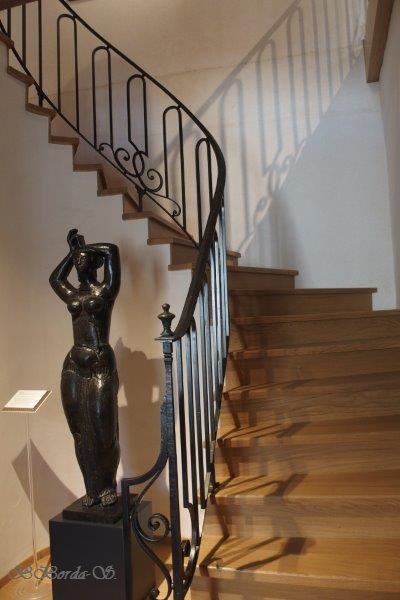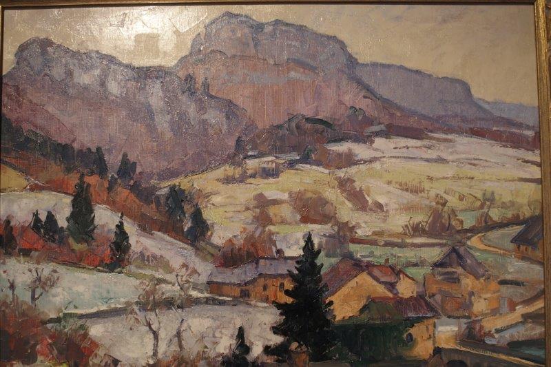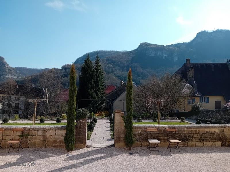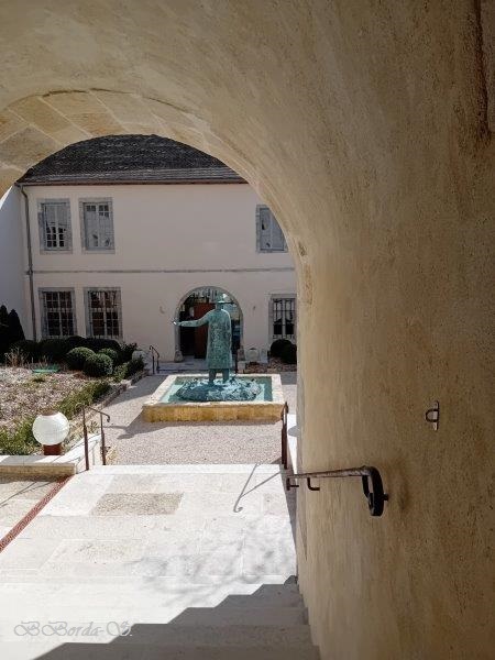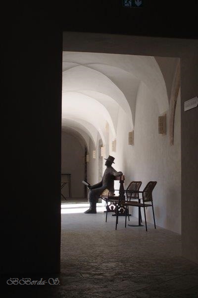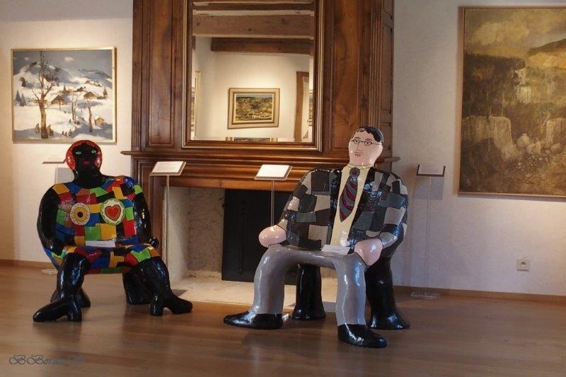 Ça, c’était pour le matin ! Ensuite, direction Mouthier-Haute-Pierre et son Prieuré (après une halte gastronomique, mais non, nous n’avons pas mangé le menu du moment, les grenouilles https://france3-regions.franceinfo.fr/bourgogne-franche-comte/doubs/besancon/1-8-million-de-grenouilles-rousses-tuees-chaque-annee-pour-etre-mangees-la-lpo-inquiete-pour-cette-espece-protegee-3326093.html#Echobox=1774887242 ). Le prieuré, magnifiquement rénové par un particulier propose un bel espace consacré aux peintre comtois des XIXème et XXème siècles. J’ai craqué pour quelques tableaux, mais hélas, je n’ai pas noté le nom des peintres et ne peux donc que vous proposer des photos… À l’entrée, nous sommes accueillis par une statue de Folon (qu’on retrouve dans le cloître). http://www.leprieuremouthier.fr