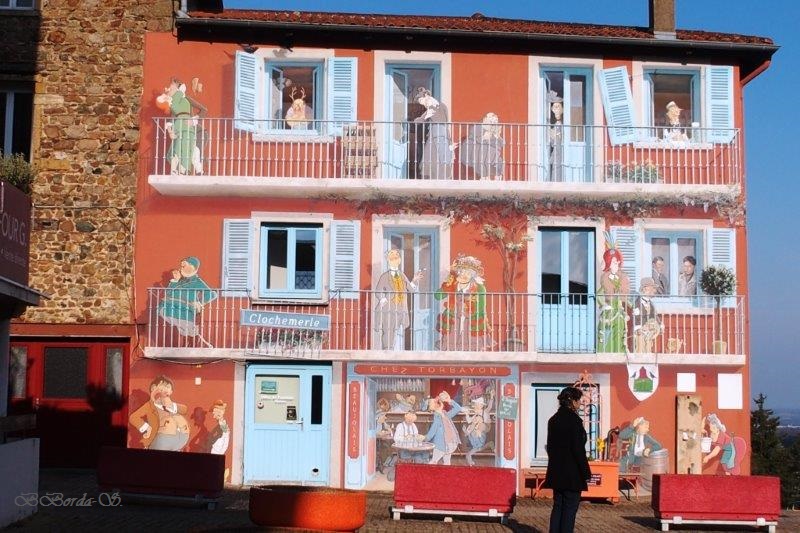 Vaux-en-Beaujolais. Le fameux village de « Clochemerle » (Gabriel Chevallier -1934). La pissotière, objet de discorde, ne trône plus au centre de la place, mais les dessins de Dubout sur les murs continuent de faire sourire… l’entrée de l’église aux chapiteaux en belle pierre dorée était fermée, dommage.