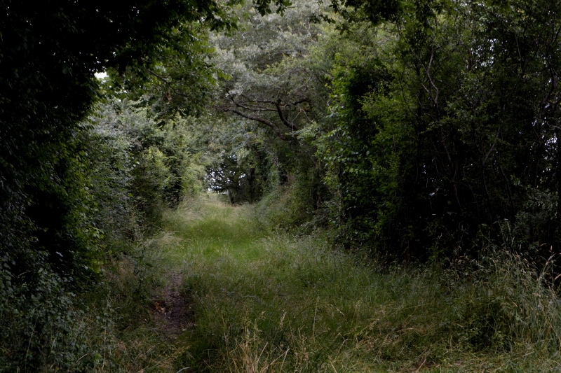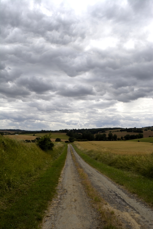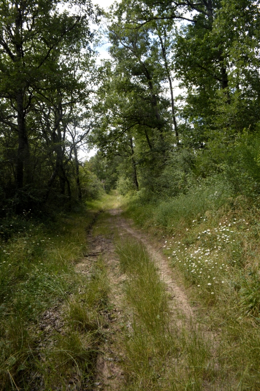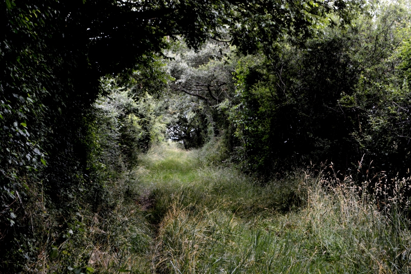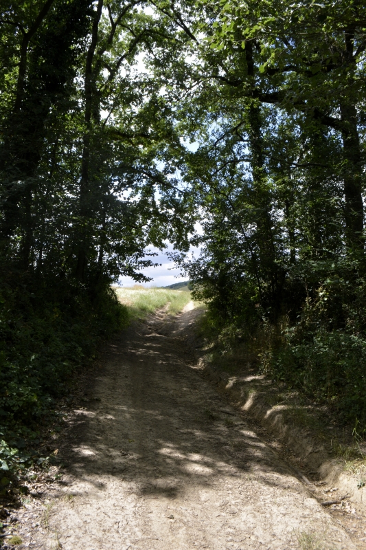 Retour sur le large chemin, et au débouché je pars à droite, le long du champ et de la forêt… tiens, la vieille maison a disparu… et le champ a doublé de volume… mais ils ont gardé le passage. Me voici à nouveau à l’entrée du bois, une autre. Encore un sentier bien tracé. Pourvu qu’il ne s’arrête pas net !