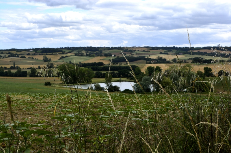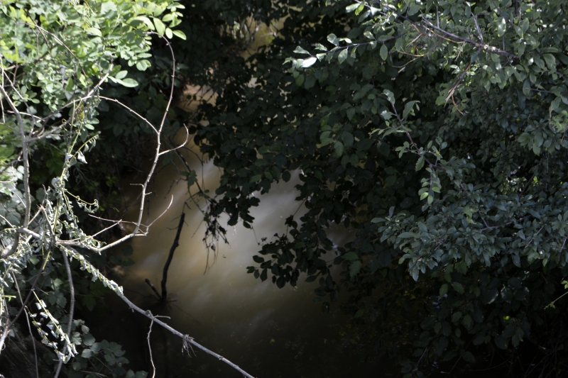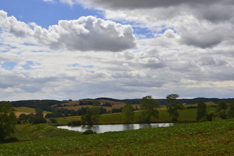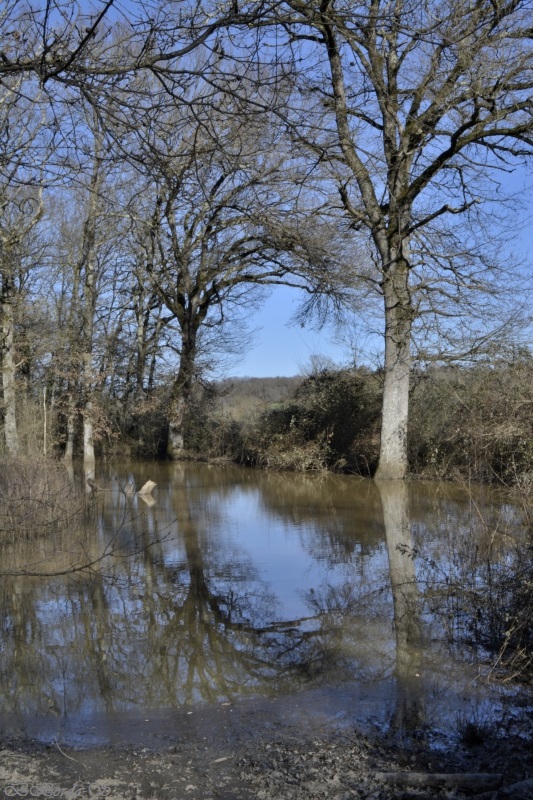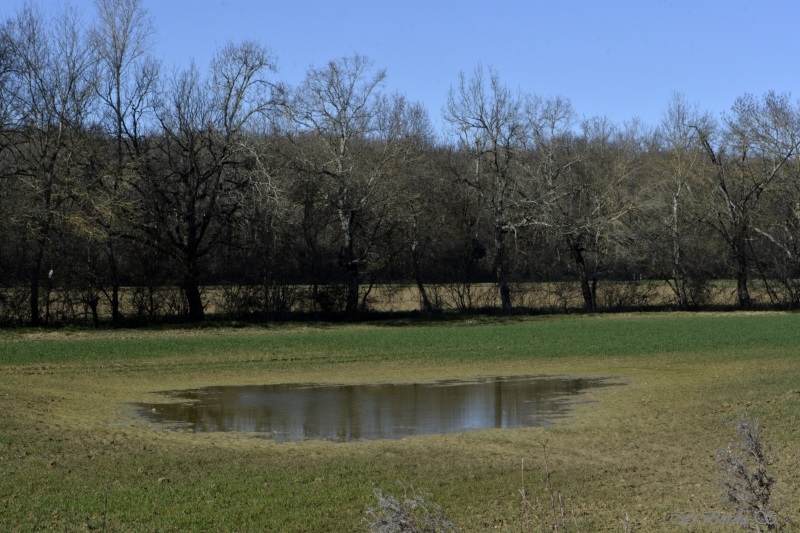Traversée des champs jusqu’au Marguestaud (qui coule encore bien), par endroits le sol est déjà fendillé de sécheresse, mais quelques flaques stagnent en bas du champ… Et avant de repartir à la recherche de mon chemin disparu, arrêt à la petite mare dans le bois pour admirer les reflets.