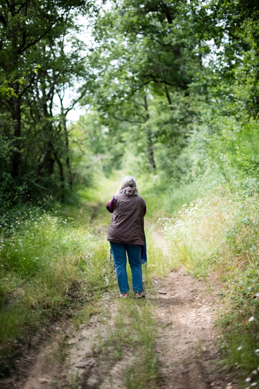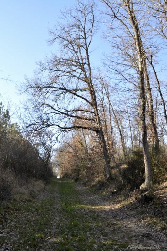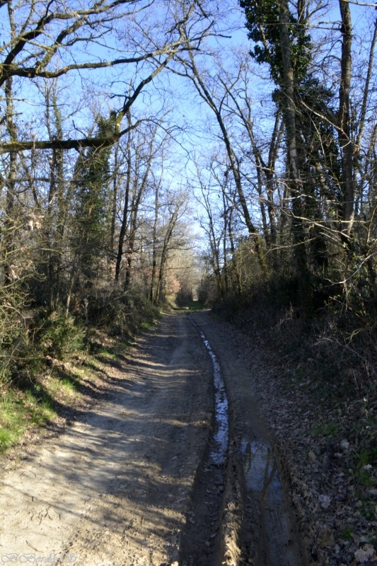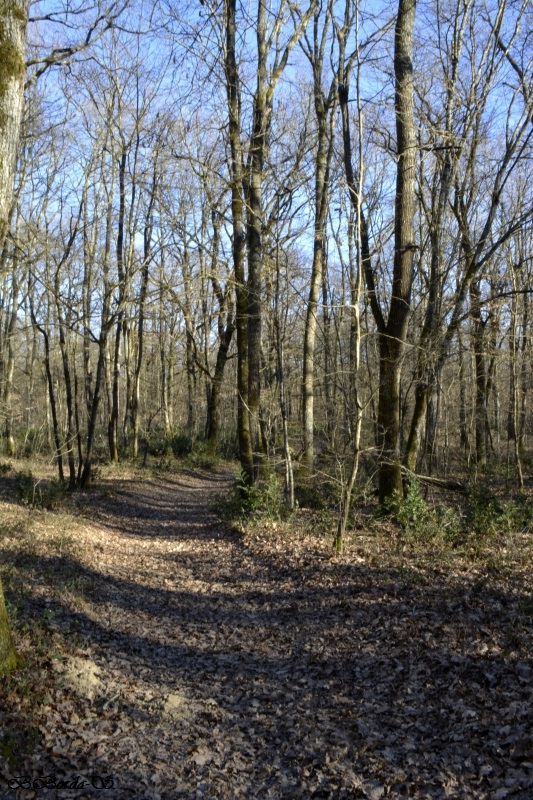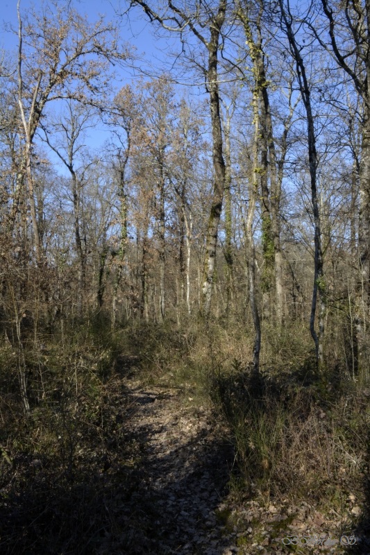 Il y avait une sortie de sentier, avant le « nettoyage » de cette partie du bois, et il rejoignait la jolie boucle qui faisait tout le tour du bois… autrefois… Je l’ai cherchée en vain plusieurs fois déjà. Cette fois, je prends le « chemin des diligences » en longeant le bois, et j’ai bien retrouvé le passage. Je me suis engagée dans ce petit sentier, pour tomber encore une fois dans un cul-de-sac ! Zut et re-zut ! Demi-tour. En faisant attention à ne pas me prendre les pieds dans les ronces… la prochaine fois, je pars avec un sécateur !