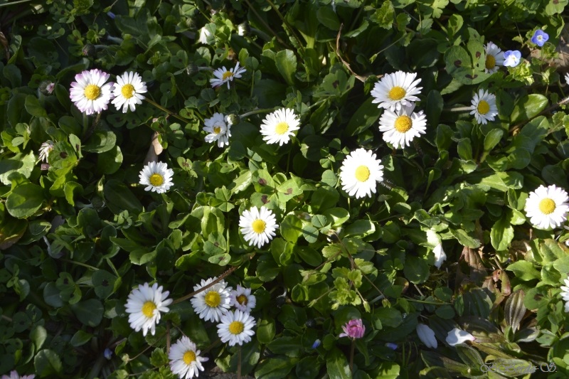 L’amandier de la voisine, les violettes du jardin, une jonquille, les haies d’églantiers, les tapis de pâquerettes… la nature renaît !