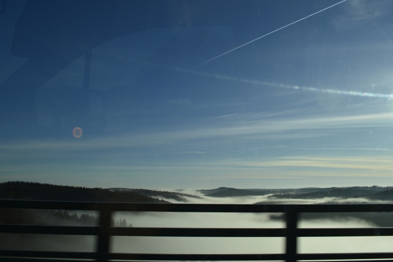 Route sous un ciel parfois bleu parfois gris, autoroute bordée par les genêts tout du long ou presque, les puys, le vert des forêts du Jura…
