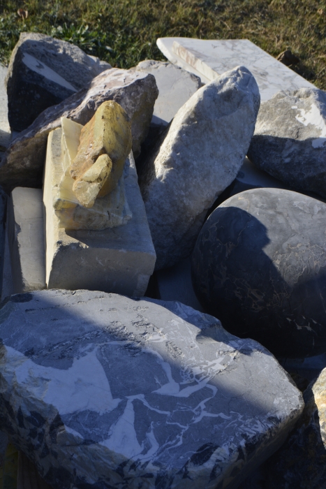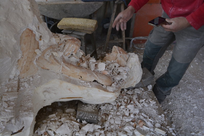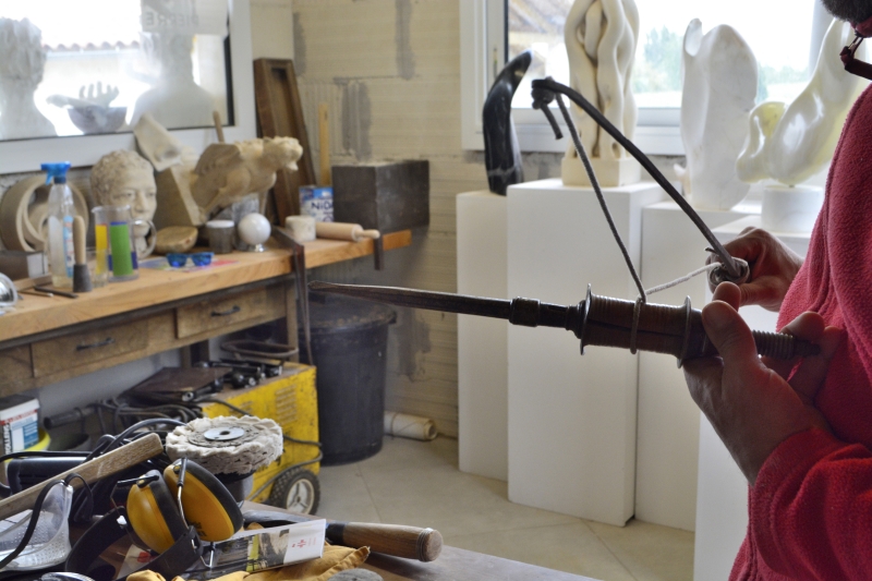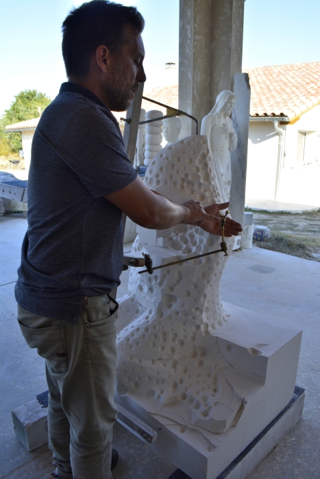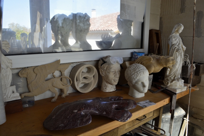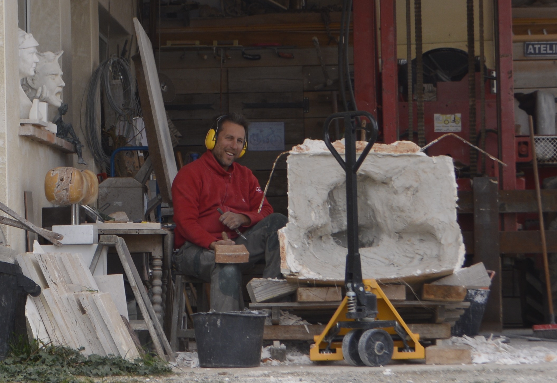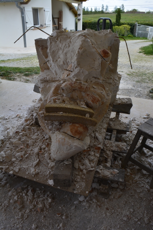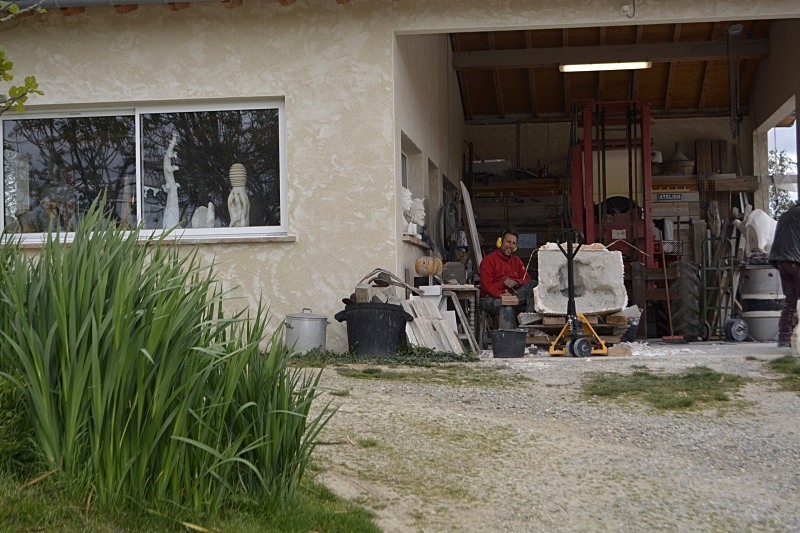 Ça, c’était le matin. En fin d’après-midi, au retour de la journée « les vieux guidons de la bastide » à Grenade, arrêt à l’atelier de sculpture de David Léger, ouvert dans le cadre de la journée « portes ouvertes des ateliers d’artistes d’Occitanie ». Je ne sais pas si beaucoup de personnes étaient au courant. Il faut dire que l’information culturelle ne semble pas non plus la priorité des médias depuis pas mal de temps… bref… Nous en avons profité pour aller voir David dans son atelier de Launac. Petit clin d’œil aux « vieux guidons de la Bastide », la très colorée vieille mobylette appuyée contre le mur 😉 . La Madone est encore en préparation, le bloc de marbre commandé s’étant fait attendre plus de 6 mois… et nous avons eu droit à une explication des mesures et de la façon de travailler d’un sculpteur actuel ! Des blocs de marbres de tous les tons vous attendent pour les stages que propose David Léger ( https://www.david-leger.com )….