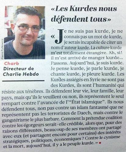 Ce dimanche 13 octobre, beaucoup d’activités au programme dans les Hauts Tolosans, et vraiment impossible de tout faire… sans oublier la manifestation contre les guerriers d’Erdogan, que les gouvernants de ce monde regardent faire en se voilant la face, alors que c’est un génocide qui se profile… Mais là, ça voulait dire encore un aller-retour à Toulouse, et ce n’était pas possible. Je sais que pas mal de copines et copains y étaient, ça ne me dédouane pas, mais ça me rassure. (Photos prises sur la page FB des cocos toulousains, et un édito de Charb, datant de quelques années puisque, hélas, Charb n’est plus de ce monde.)
