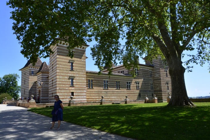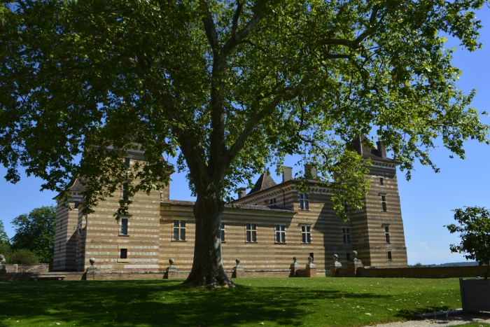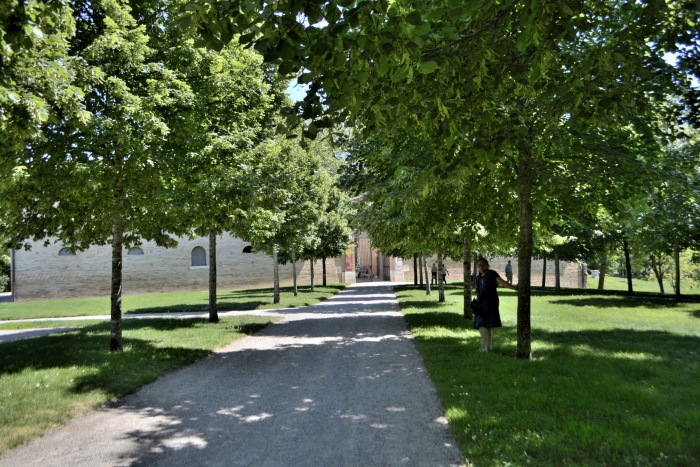 Pour entrer dans la cour du château de Laréole, nous avons le choix entre deux allées, toutes deux joliment bordées d’arbres. Nous sommes arrivées par l’allée de la place du village. Très agréable, mais pas sympa pour les sandales d’été… les gravillons se faufilent partout 😉 !
