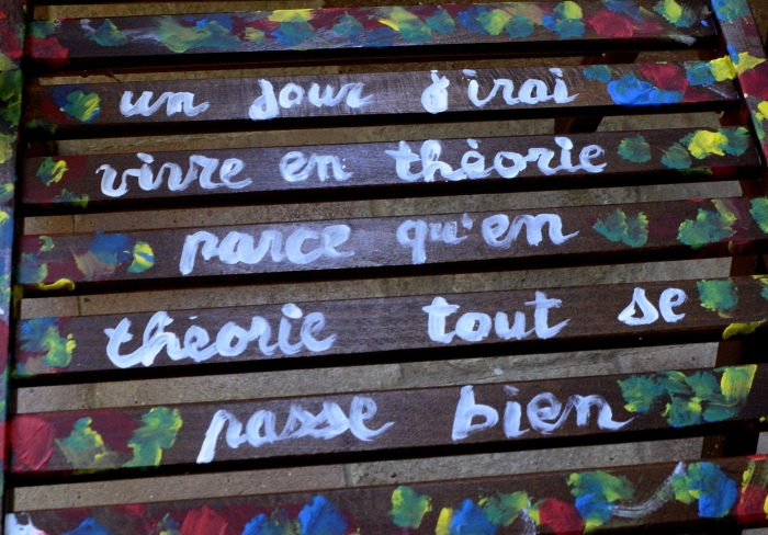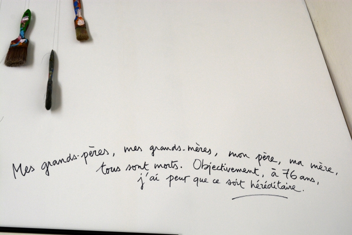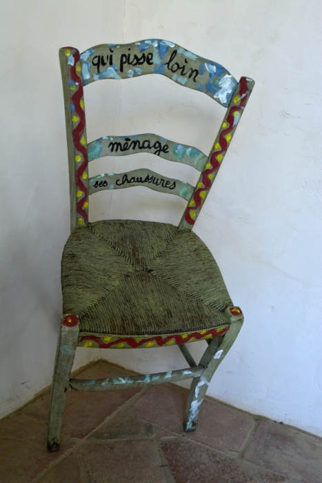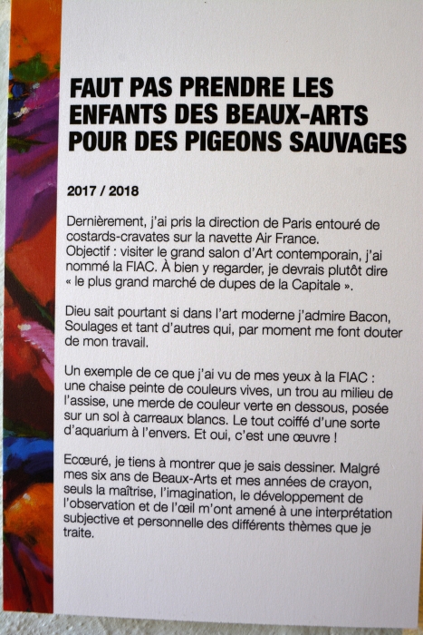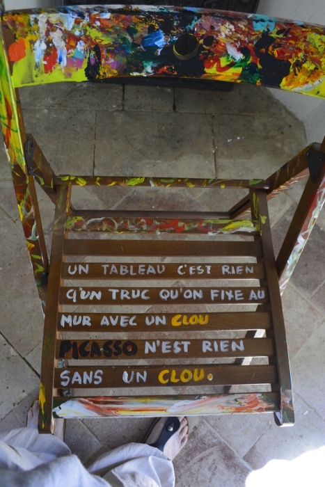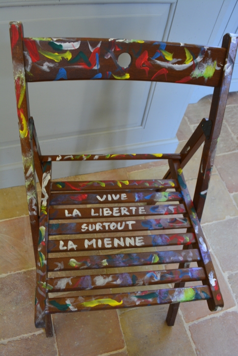 Des textes de présentation intéressants, et un qui m’a vraiment amusée, me rappelant mon indignation devant certaine « installation » prétendûment artistique au musée de Ca Pesaro (Venise, art du XXème et contemporain). Certaines « œuvres » (chaises bariolées aux citations parfois burlesques) un brin potaches… n’oublions pas que Bernard Cadène a « fait » les Beaux Arts et participé à la fanfare des Beaux Arts, à Toulouse…