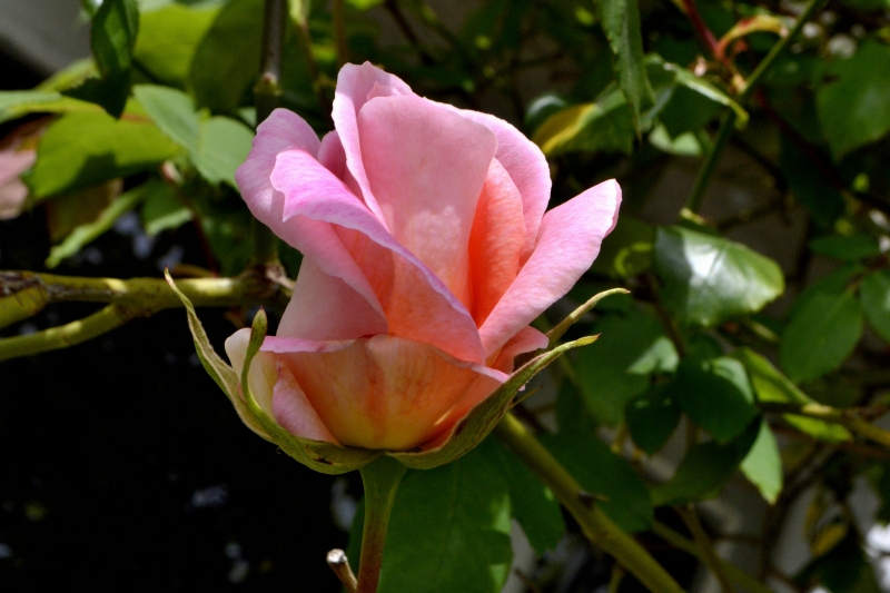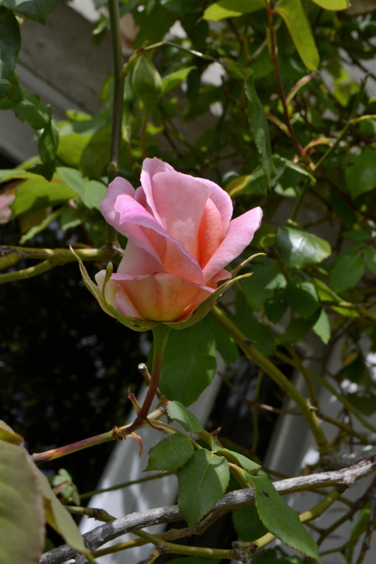 Au jardin, une rose emperlée de pluie, les bergenia fleurissent, sauges et roses rouges pour Ganesh…