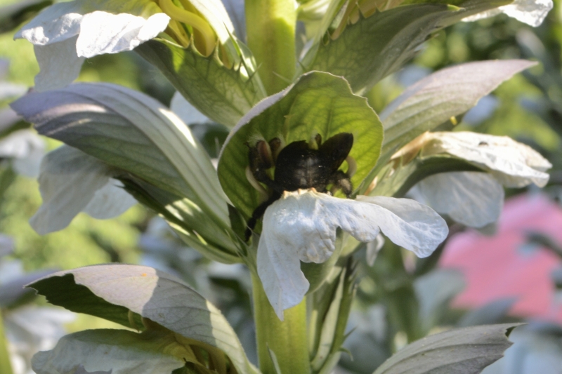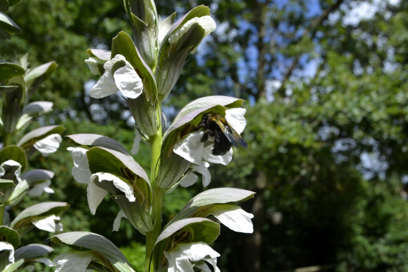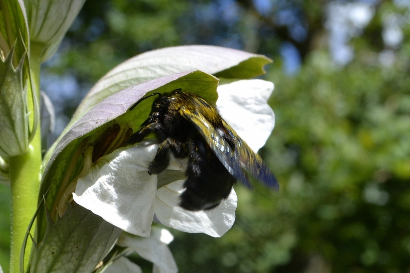 Les grosses abeilles charbonnières se régalent dans les fleurs d’acanthe ! Étonnantes fleurs, dans lesquelles ces abeilles se glissent, pour en ressortir à reculons avant de s’envoler vers la fleur suivante.