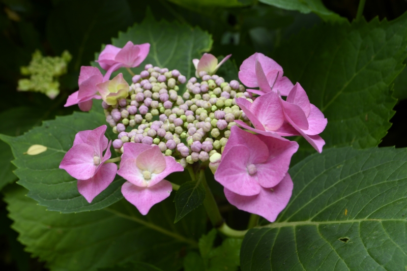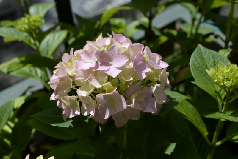 Installé à l’ombre depuis de longues années, un hydrangea/hortensia commence à fleurir, tandis que l’hortensia tout simple, un peu plus loin (mais peut-être trop au soleil ?), a du mal à se colorer… on est loin des hortensias de la maison de ma jeunesse, à Anglet !