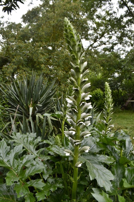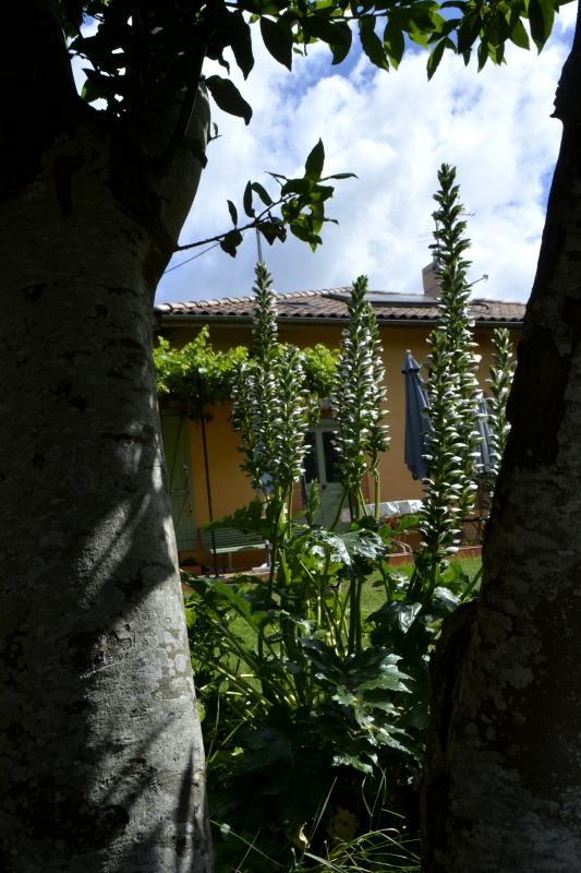Depuis la terrasse, les hampes des acanthes rivalisent avec les parasols fermés ce matin-là… un peu de fraîcheur bienvenue avant un retour de la canicule !
