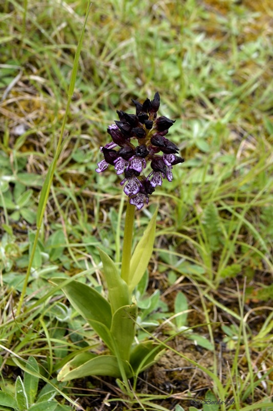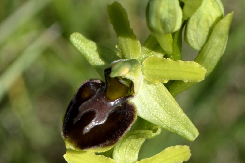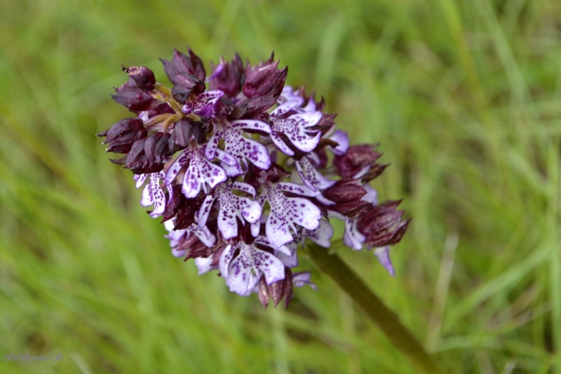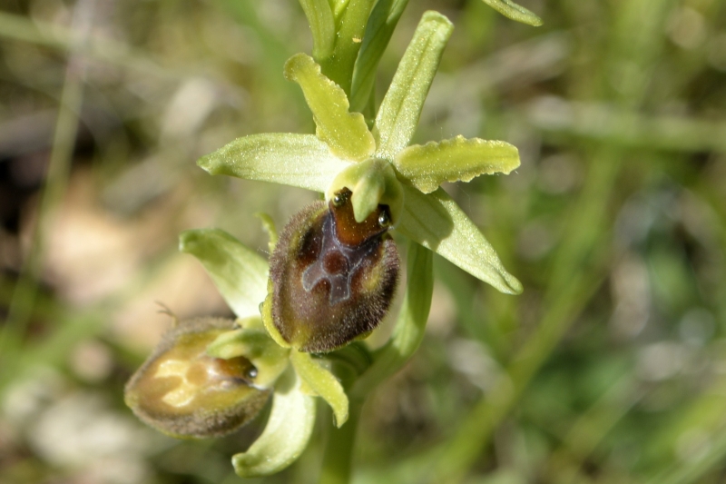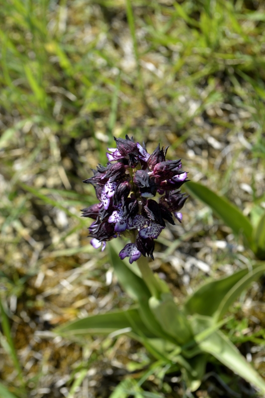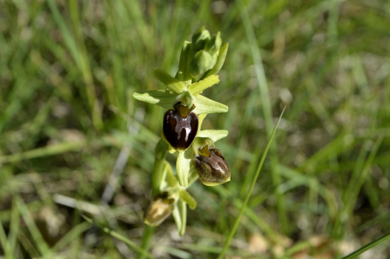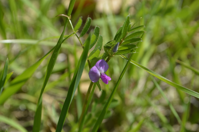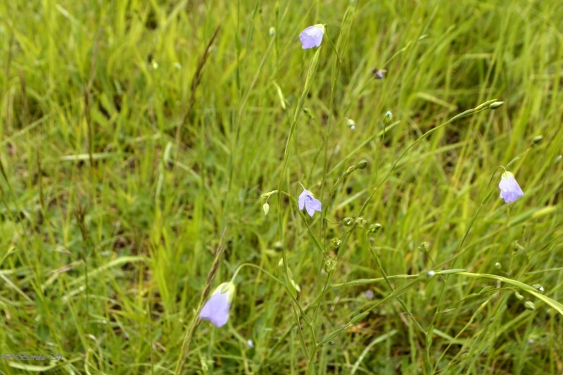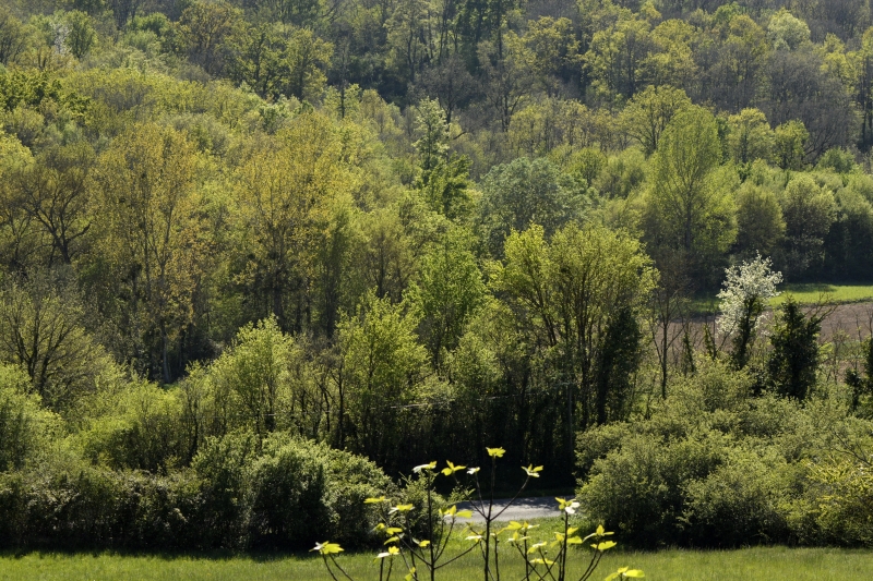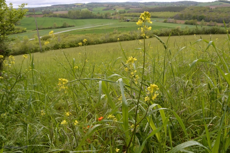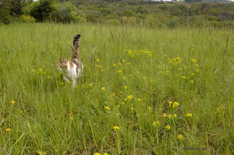 Et nous voici dans le champ… parsemé de ces « herbes-fleurs » vert citron, et de quelques fleurs de colza égarées… mais aussi des premiers orchis, quelques marguerites, des boutons d’or, des herbes folles et de jolies fleurs bleues délicates balancées par le vent. Flipelette tantôt me suit, tantôt me devance, selon les odeurs et bruits autour de nous ! Au loin, dans le bois, le coucou s’en donne à cœur joie. Et tout autour de nous, c’est un vrai concert de chants différents. Rythmés par les coups de canon des agriculteurs… censés éloigner les animaux sauvages des semailles… mais qui ne semblent pas inquiéter les oiseaux !